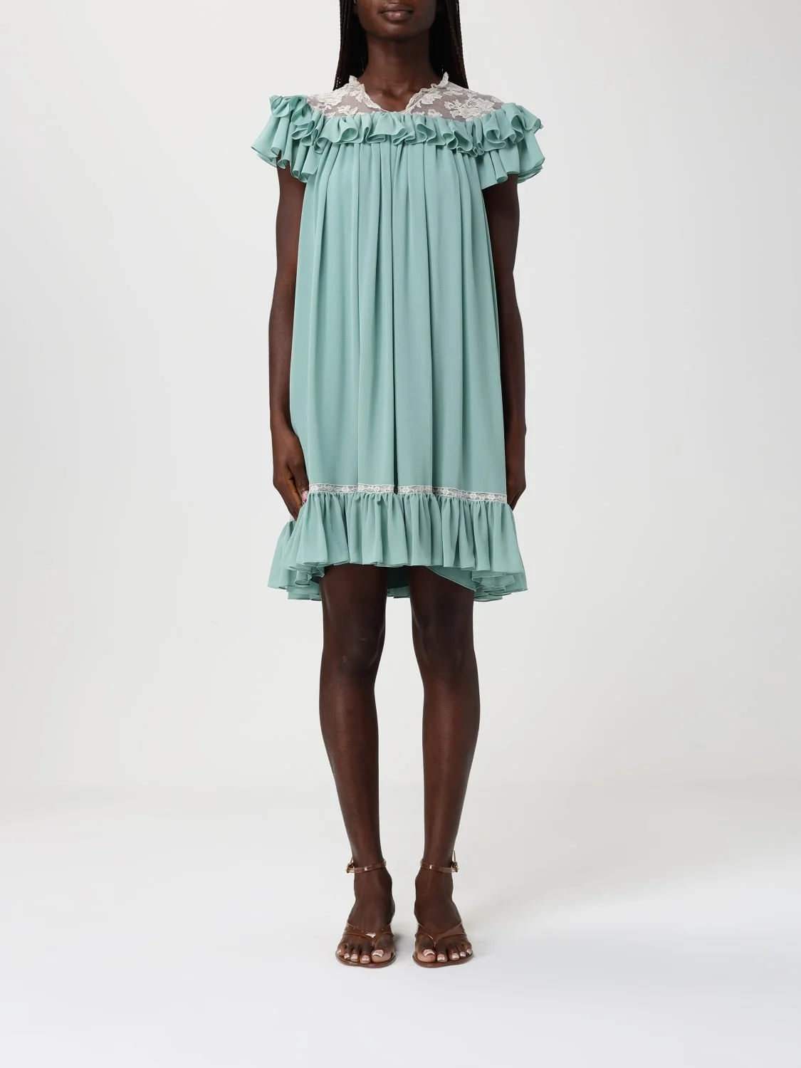 DESCRIPTION - Style: Romantic - Details: With ruffles - Model: Pleated - Neckline: V neckline - Closure: Back teardrop - Bottom: With flounce - Length: Mini dresses - Occasion: Ceremony and cocktail dresses, Morning dresses - Sleeves: Short-sleeve dresses - Materials: Georgette - Pattern: Plain-colored DETAILS AND CARE Composition not available SIZE AND FIT Sizes not available Size and fit Regular fit Designer code: CH26SRO75002 34F Giglio Code: H82160 Designer: Chloe Collection: Clothing Chloe Category: Clothing > Dress