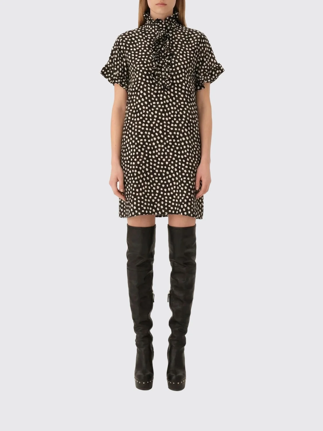 DESCRIPTION - Style: Vintage - Model: Sheath - Neck: High - Shoulders: Regular - Bottom: With straight hemline - Length: Mini dresses - Occasion: Morning dresses - Sleeves: Short-sleeve dresses - Materials: Silk - Pattern: Polka dots DETAILS AND CARE Composition SHELL: 100% SILK/BUTTON: MOP MOP (PINCTADA MA SIZE AND FIT Sizes not available Size and fit Regular fit Designer code: CH26SRO50300 915 Giglio Code: H85368 Designer: Chloe Collection: Chloe Woman Category: Clothing Chloe