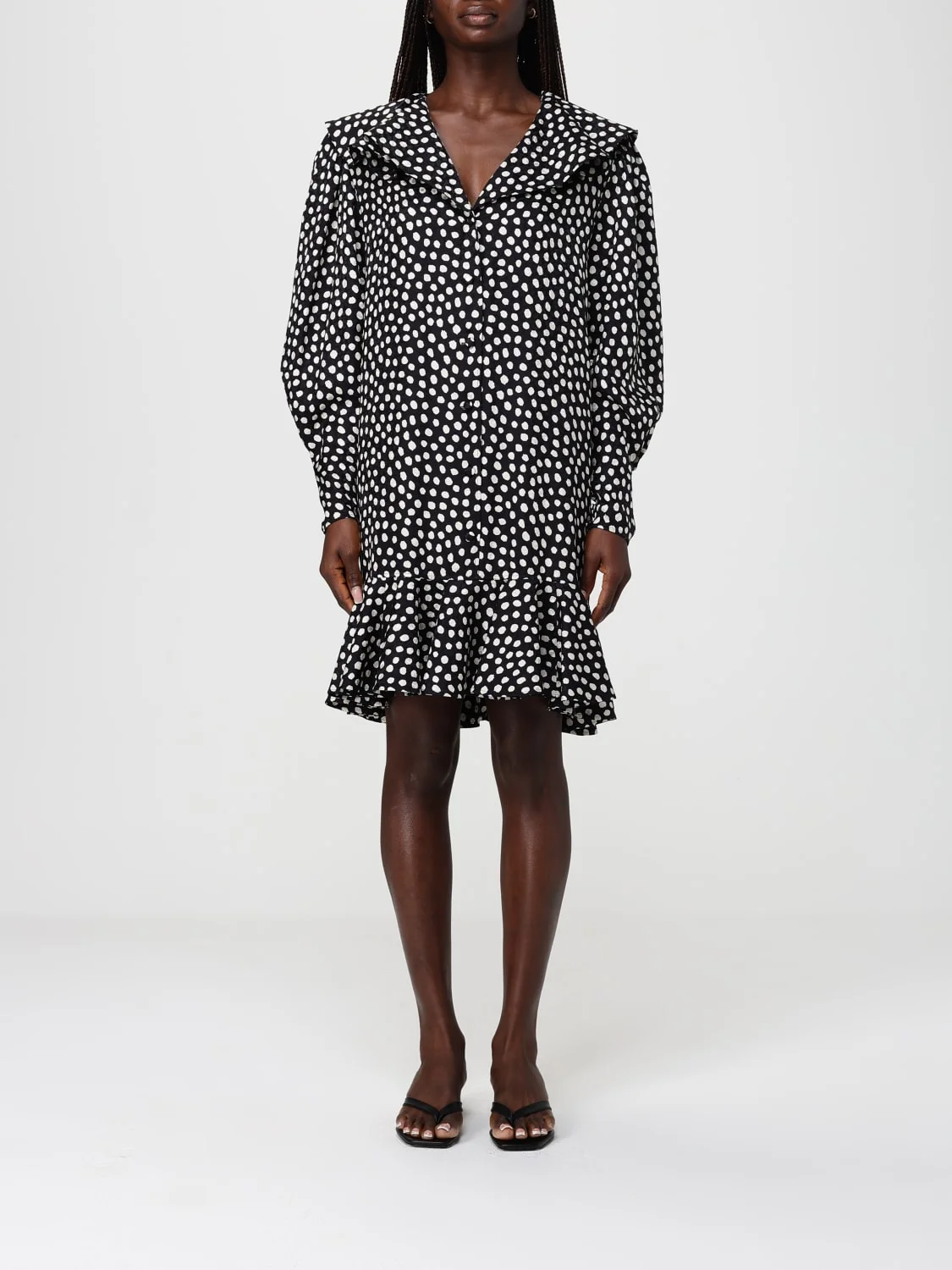 DESCRIPTION - Style: Pop - Model: Chemisier - Neck: Sailor dress - Neckline: V neckline - Shoulders: Regular - Closure: With buttons - Bottom: With flounce - Length: Mini dresses - Occasion: Morning dresses - Sleeves: Long sleeve dresses - Materials: Silk - Pattern: Polka dots DETAILS AND CARE Composition 100% Silk SIZE AND FIT Sizes not available Size and fit Regular fit Designer code: CH26SRO37300 915 Giglio Code: H89139 Designer: Chloe Collection: Clothing Chloe Category: Clothing > Dress