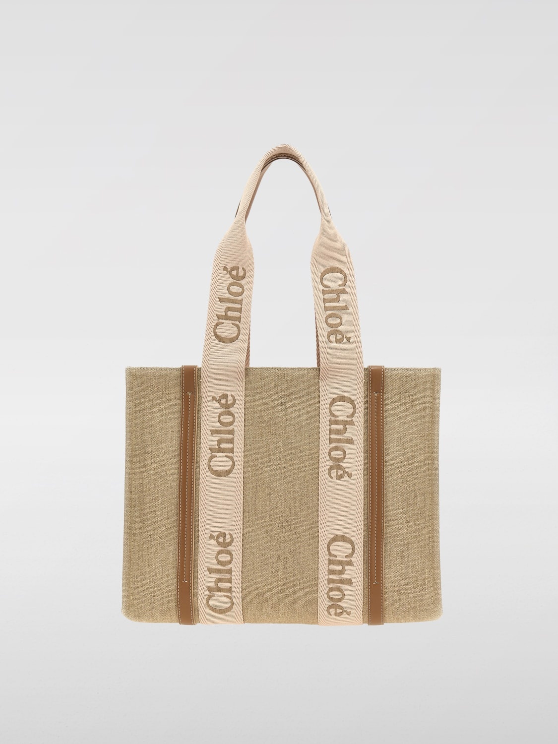 DESCRIPTION - Logo: Embroidered - Lining: With patch pockets, With logo, Canvas - Model: Shoulder , Tote - Shape: Rectangular - Handle: Double - Materials: Linen, Canvas, Smooth calfskin - Pattern: All-over logo DETAILS AND CARE Composition 100% linen SIZE AND FIT Sizes Width : 37 cm Height: 26 cm Depth: 12 cm Handle height: 25 cm Designer code: CHC23AS383L17 26Y Giglio Code: G43951 Designer: Chloe Collection: Chloe Woman Category: Bags Chloe