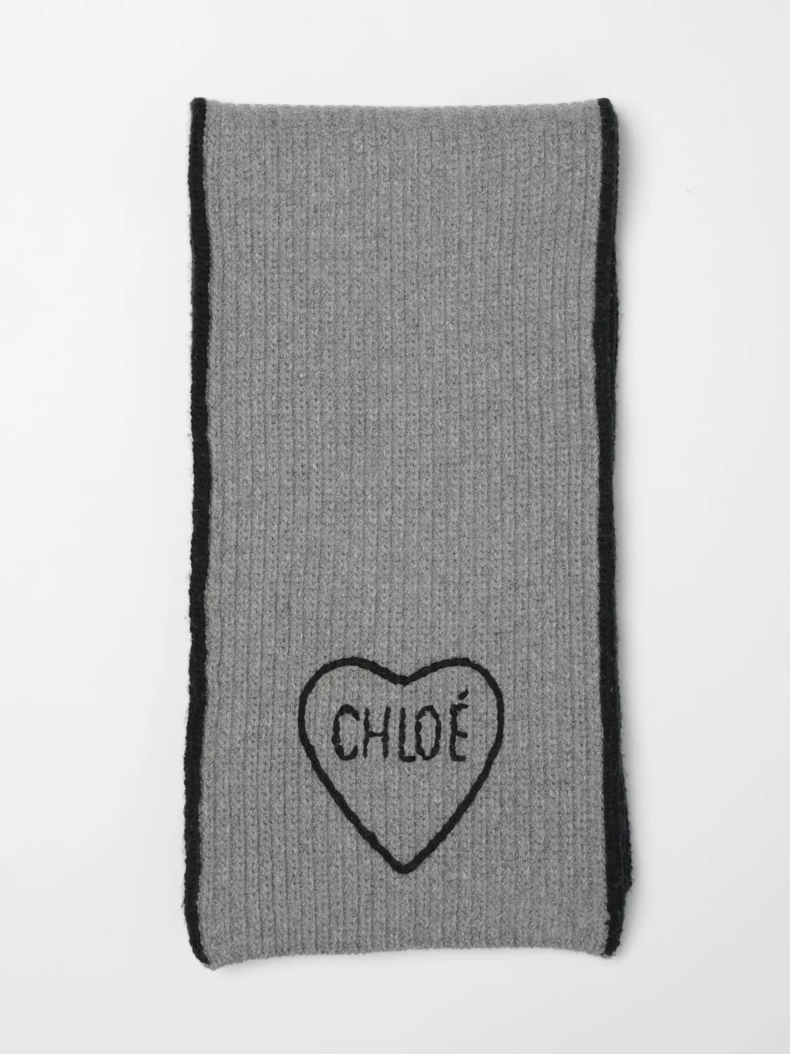 DESCRIPTION - Style: Casual, Romantic - Logo: Embroidered, Lettering - Details: WIth contrasting edges - Bottom: With straight hemline - Shape: Rectangular - Occasion: Morning - Model: Ribbed - Materials: Virgin wool - Pattern: Hearts DETAILS AND CARE Composition 71% virgin wool 29% cashmere SIZE AND FIT Sizes not available Designer code: CH26SKS05WCS 012 Giglio Code: H87212 Designer: Chloe Collection: Chloe Woman Category: Accessories Chloe