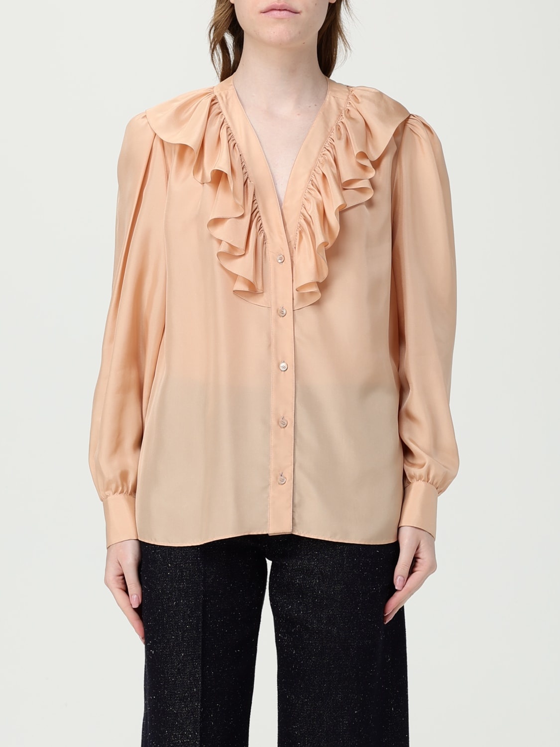 DESCRIPTION - Style: Elegant - Details: With ruffles - Neckline: V neckline - Shoulders: Relaxed - Closure: With buttons - Bottom: With curved hemline - Sleeves: Long sleeve shirts - Materials: Silk - Pattern: undefined DETAILS AND CARE Composition 100% seta SIZE AND FIT Sizes not available Size and fit Relaxed fit Designer code: CH25UHT67489 6H7 Giglio Code: G99065 Designer: Chloe Collection: Chloe Woman Category: Clothing Chloe