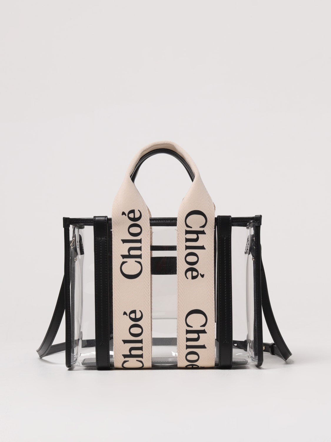 DESCRIPTION - Logo: Jacquard - Lining: With patch pockets, PVC, With logo - Model: Hand, Transparent - Shape: Rectangular - Handle: Double - Shoulder strap: Adjustable and removable - Materials: Canvas, PVC, Smooth calfskin - Pattern: Logo DETAILS AND CARE Composition not available SIZE AND FIT Sizes Width : 26,5 cm Height: 20 cm Depth: 8 cm Handle height: 11 cm Designer code: CH25US397P65 101 Giglio Code: G69402 Designer: Chloe Collection: Chloe Woman Category: Bags Chloe
