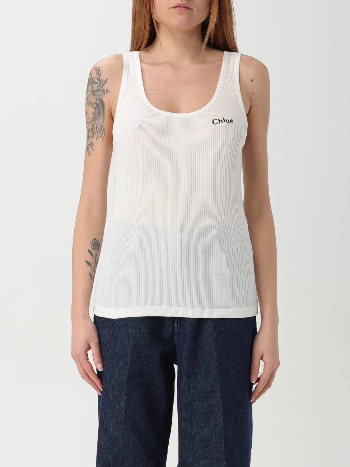 DESCRIPTION - Style: Basic - Logo: Contrasting - Model: Stretch - Neckline: U neckline - Shoulders: Regular - Sleeves: Sleeveless - Bottom: With straight hemline - Materials: Cotton - Pattern: Plain-colored, All-over logo DETAILS AND CARE Composition Scollatura arrotondata Senza maniche Lavorazi SIZE AND FIT Sizes not available Size and fit Slim fit Designer code: CH25SJH12180 101 Giglio Code: G48092 Designer: Chloe Collection: Chloe Woman Category: Clothing Chloe