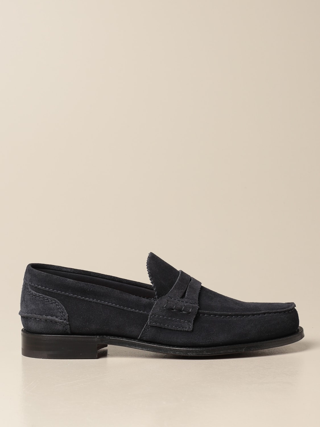 DESCRIPTION - Details: With penny keeper - Lining: Leather, With logo - Toe: Round, Raised toe box - Sole: Leather - Materials: Suede calfskin - Pattern: Plain-colored DETAILS AND CARE Composition 100 AF SIZE AND FIT Sizes not available Designer code: EDB003 9VE F0ABM Giglio Code: 332029 Designer: Church's Collection: Church's Men Category: Shoes Church's