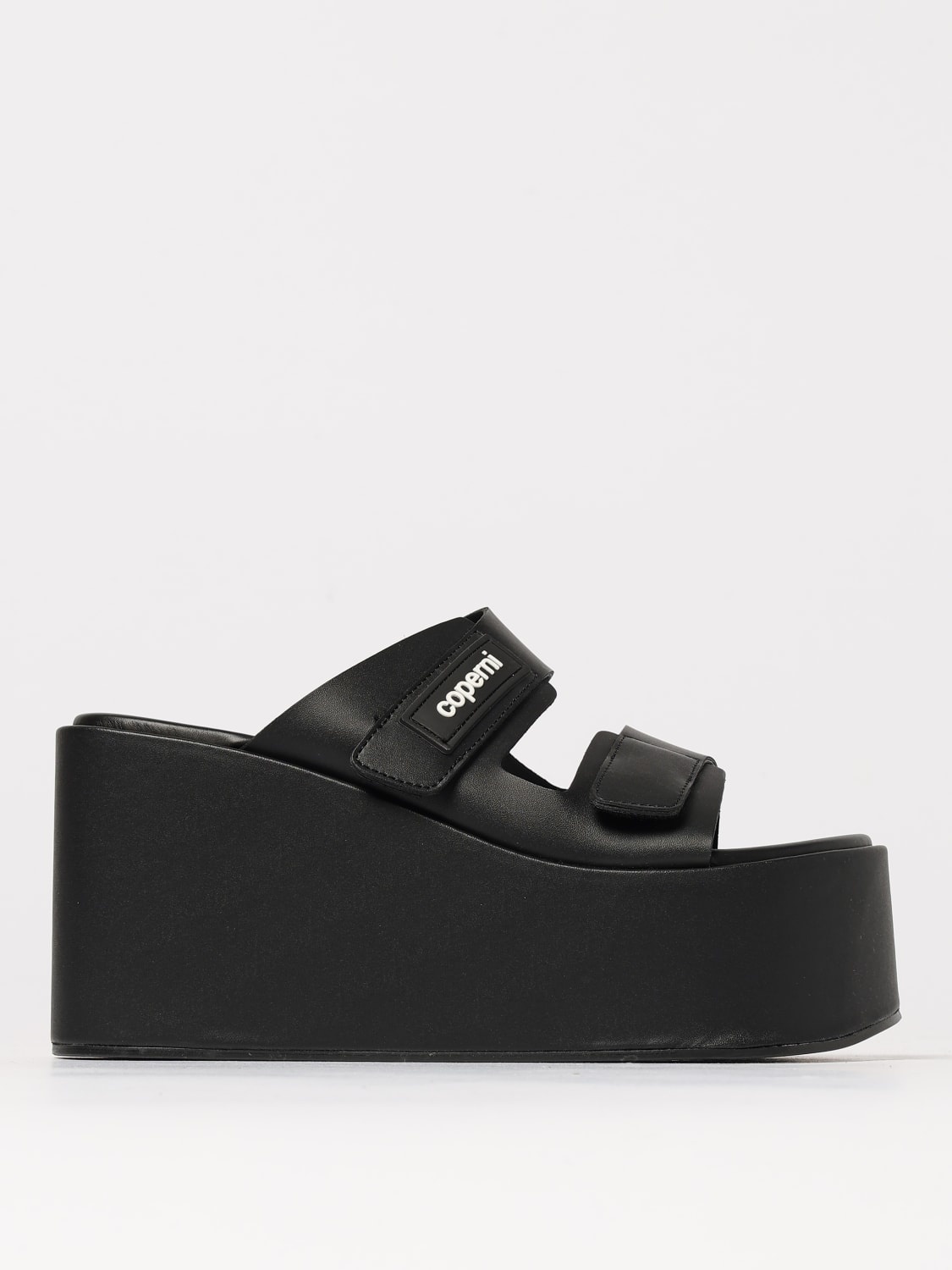 DESCRIPTION - Style: Contemporary - Logo: Contrasting - Model: Wedge - Toe: Round - Heel: Open, High heel - Sole: Rubber - Closure: With velcro strap - Materials: Polyutherane - Pattern: Logo DETAILS AND CARE Composition upper-100% polyurethane SIZE AND FIT Sizes Heel: 9,5 cm Designer code: COPSH76F6015 BLK Giglio Code: 421861 Designer: Coperni Collection: Coperni Woman Category: Shoes Coperni