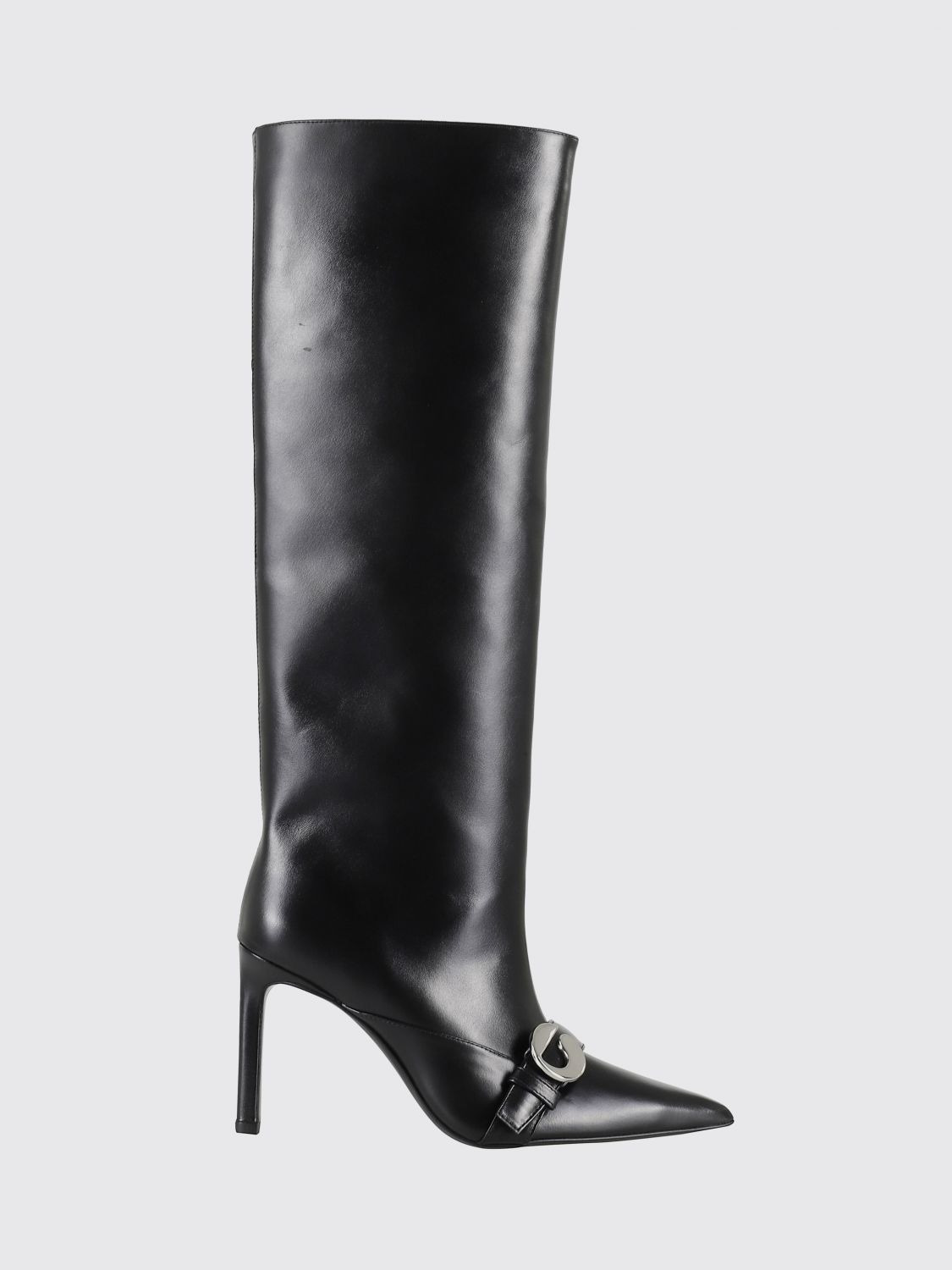 DESCRIPTION - Logo: Metallic - Lining: Leather, With logo - Model: Slip on - Toe: Almond - Shaft: Knee-high - Sole: Leather - Heel: Tacco alto a stiletto - Materials: Smooth calfskin - Pattern: Logo, Plain-colored DETAILS AND CARE Composition | LEATHER SIZE AND FIT Sizes Heel: 9 cm Designer code: COPSH86F6058 BLK Giglio Code: H33357 Designer: Coperni Collection: Coperni Woman Category: Shoes Coperni