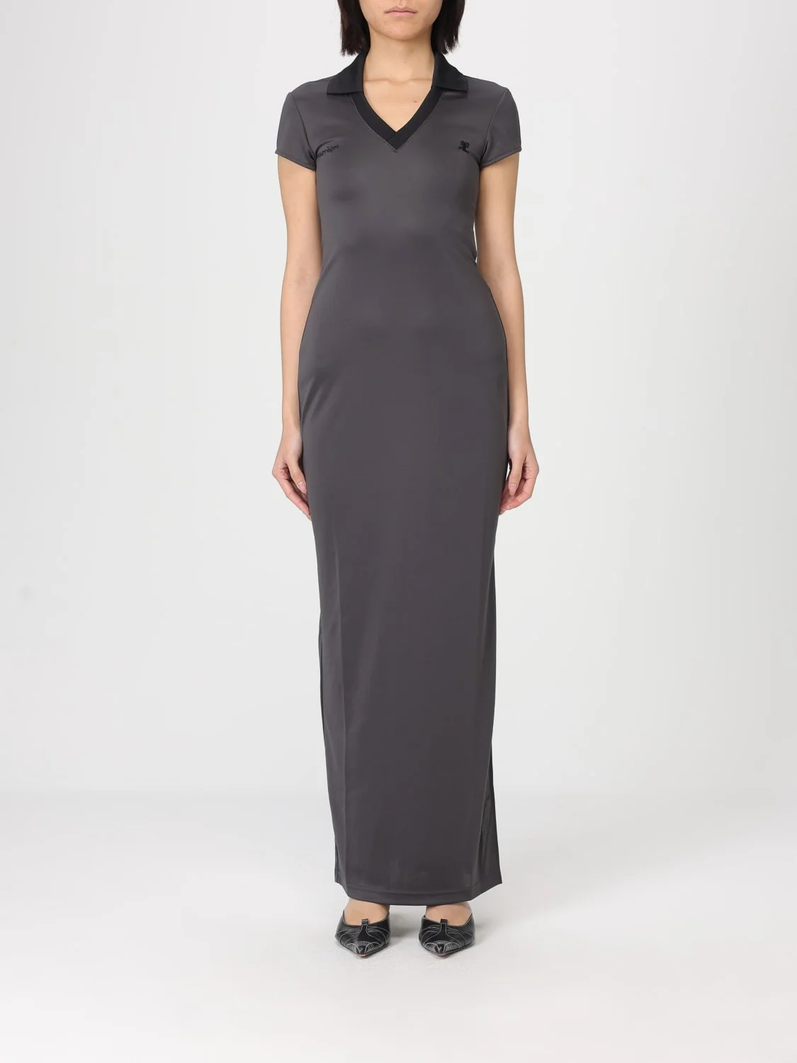 DESCRIPTION - Style: Sporty - Model: Polo - Neck: Classic - Neckline: V neckline - Shoulders: Regular - Bottom: With straight hemline - Length: Long dresses - Occasion: Morning dresses - Sleeves: Short-sleeve dresses - Materials: Jersey - Pattern: Plain-colored DETAILS AND CARE Composition not available SIZE AND FIT Sizes not available Size and fit Slim fit Designer code: 126JRO807JS0195 B214 Giglio Code: H83613 Designer: Courreges Collection: Courreges Woman Category: Clothing Courreges