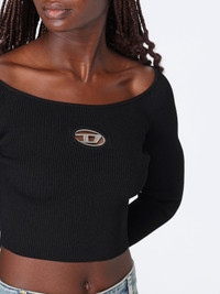 DESCRIPTION Editorial Notes Sweater woman Diesel - Style: Urban-street - Logo: Diesel Oval D - Neckline: Boat - Shoulders: Regular - Sleeves: Long - Bottom: With straight hemline - Materials: Stretch viscose - Pattern: Plain-colored DETAILS AND CARE Composition 83%VI 17%PL SIZE AND FIT Sizes not available Size and fit Cropped fita , Slim fit Designer code: A141890DLAX 9XX Giglio Code: 411671 Designer: Diesel Collection: Diesel Woman Category: Clothing Diesel