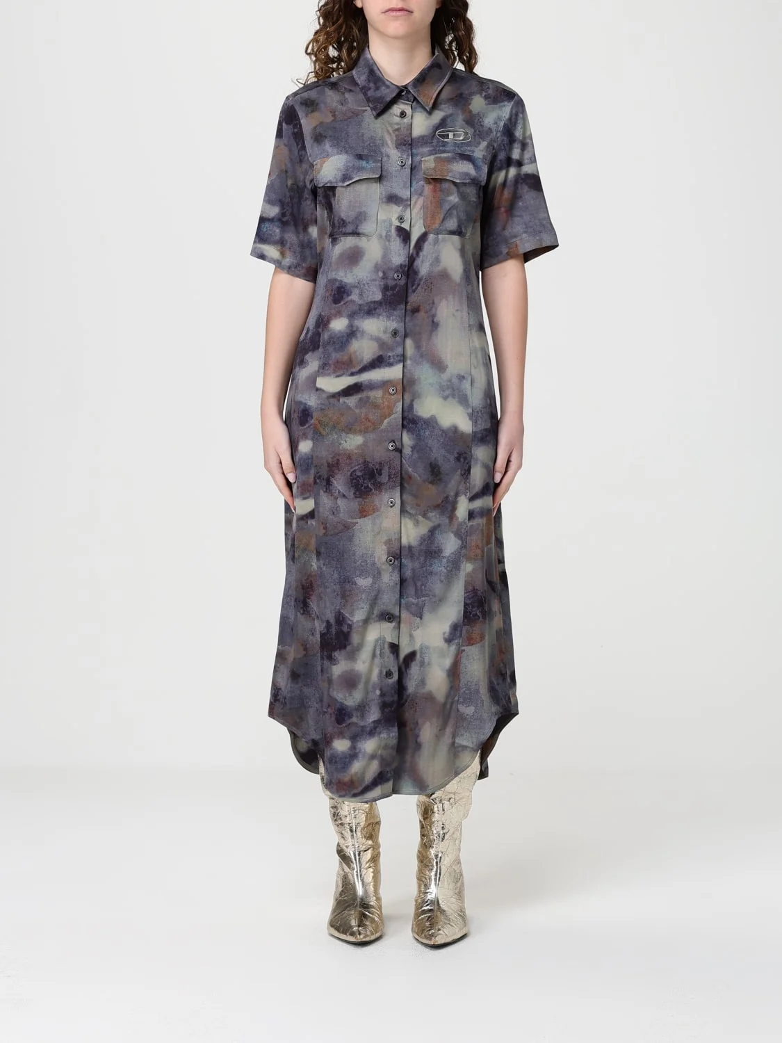 DESCRIPTION - Style: Contemporary, Urban-street - Model: Chemisier - Neck: Classic - Shoulders: Regular - Closure: With buttons - Bottom: With curved hemline - Logo: Diesel Oval D - Pockets: Patch with flap - Length: Long dresses - Occasion: Morning dresses - Sleeves: Short-sleeve dresses - Materials: Viscose - Pattern: Abstract DETAILS AND CARE Composition not available SIZE AND FIT Sizes not available Size and fit Regular fit Designer code: A203230DMBN 8ATA Giglio Code: I01754 Designer: Diesel Collection: Clothing Diesel Category: Clothing > Dress