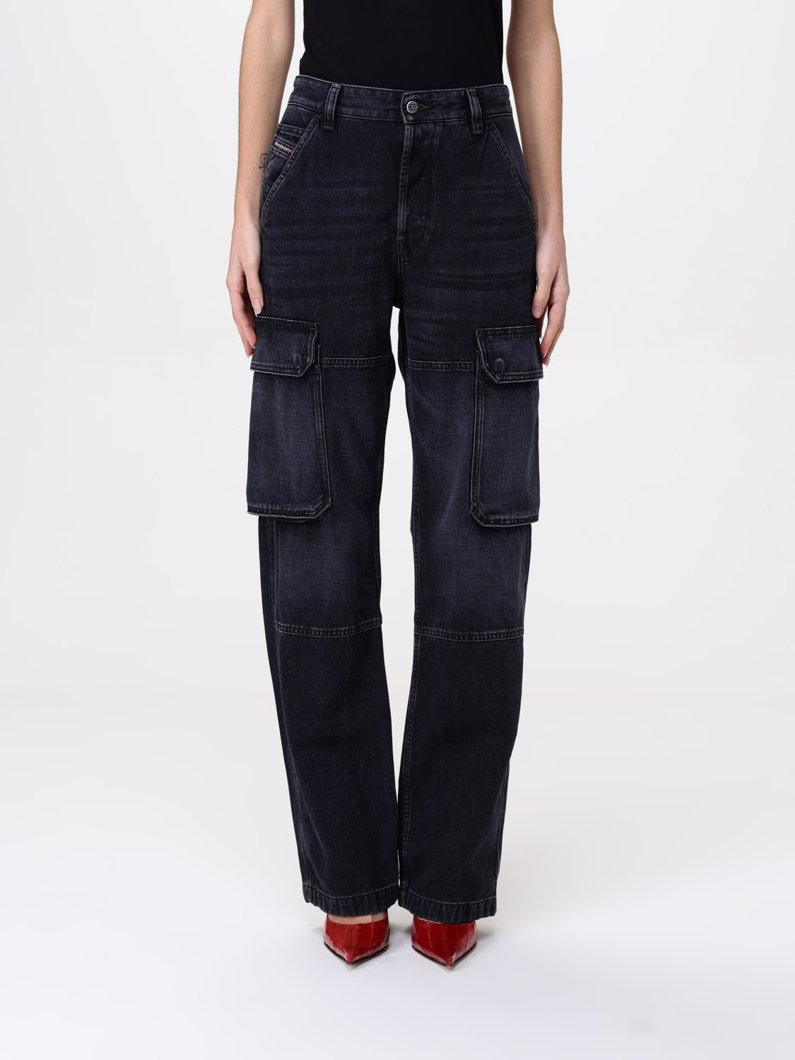 DESCRIPTION - Style: Urban-street - Model: Cargo - Pockets: Cargo - Waist: High waist - Bottom: With straight hemline - Closure: With button and zip - Materials: Cotton denim - Pattern: Plain-colored DETAILS AND CARE Composition 59% Cotone 41% Modal SIZE AND FIT Sizes not available Size and fit Regular fit Designer code: A16355007Z9 02 Giglio Code: G47800 Designer: Diesel Collection: Diesel Woman Category: Clothing Diesel