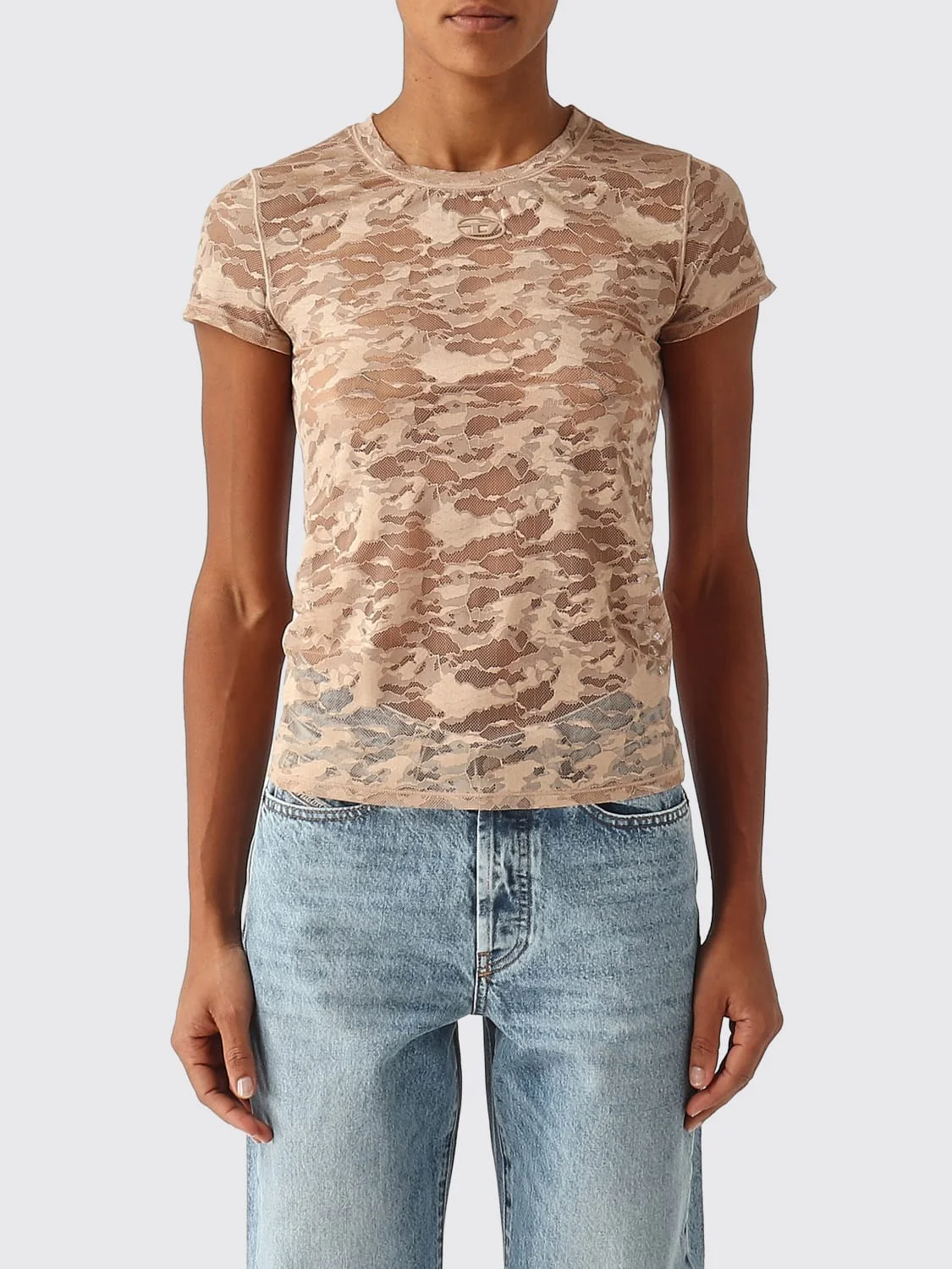 DESCRIPTION - Style: Romantic - Model: Crewneck - Neckline: Crewneck - Shoulders: Regular - Sleeves: Short - Bottom: With straight hemline - Logo: Diesel Oval D - Materials: Lace - Pattern: Plain-colored DETAILS AND CARE Composition | SIZE AND FIT Sizes not available Size and fit Slim fit Designer code: A183150DRAK 7FS Giglio Code: H81883 Designer: Diesel Collection: Clothing Diesel Category: Clothing > T-Shirt
