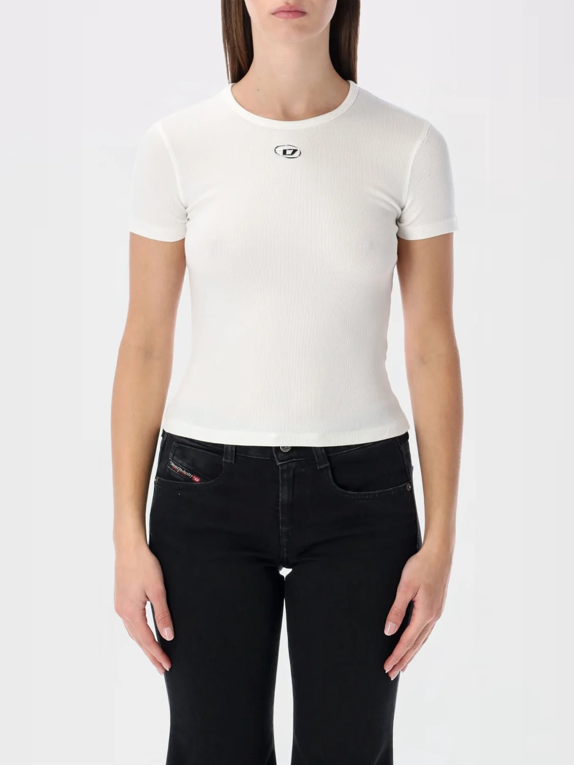 DESCRIPTION - Style: Sporty - Neckline: Crewneck - Shoulders: Regular - Sleeves: Short - Bottom: With straight hemline - Logo: Diesel Oval D - Materials: Stretch cotton - Pattern: Logo, Plain-colored DETAILS AND CARE Composition 96%Cotton 4%Elastane-Spandex SIZE AND FIT Sizes not available Size and fit Slim fit Designer code: A199100JMBA 141 Giglio Code: 438895 Designer: Diesel Collection: Diesel Woman Category: Clothing Diesel