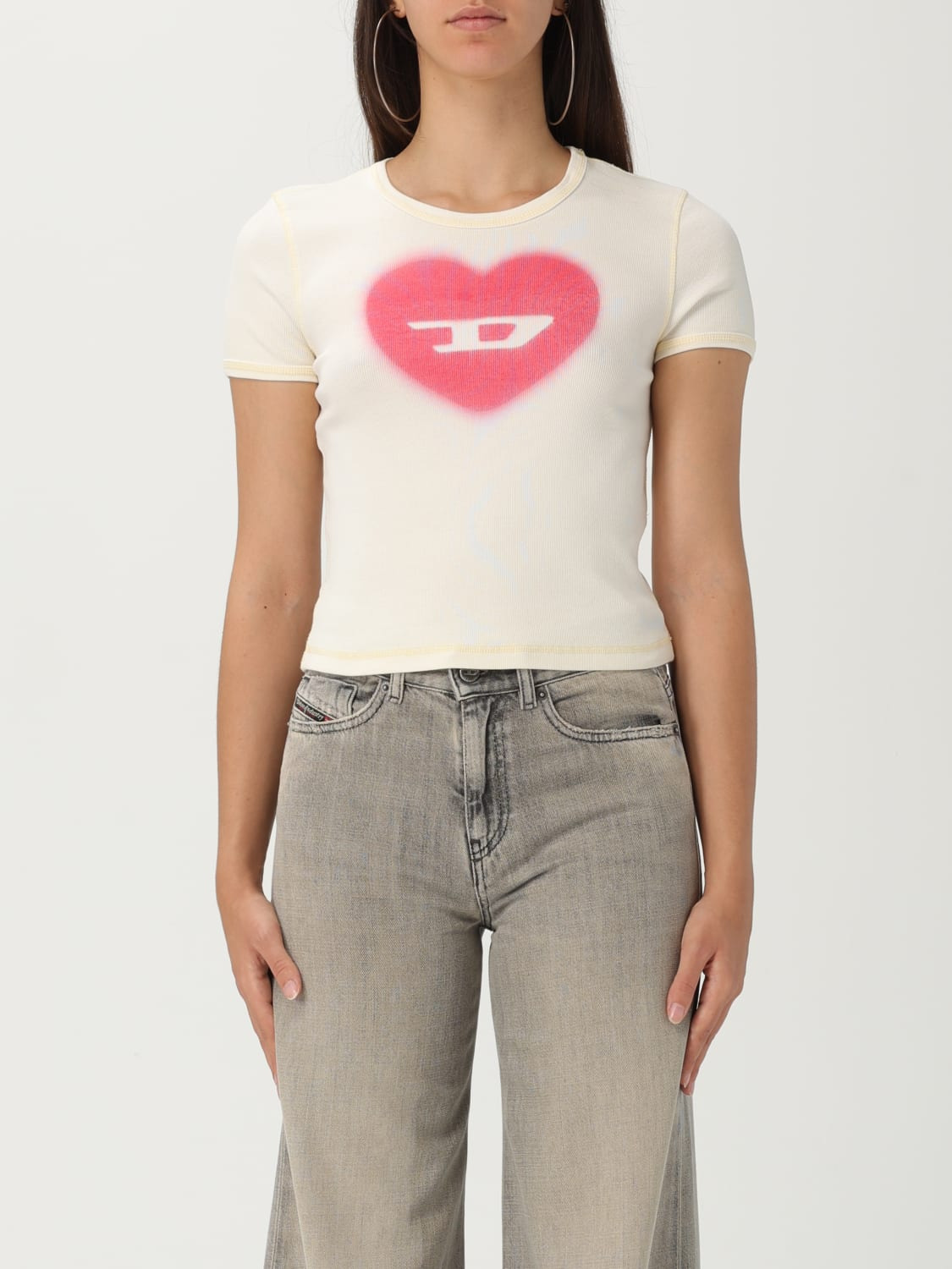 DESCRIPTION - Style: Urban-street - Model: Ribbed - Neckline: Crewneck - Shoulders: Regular - Sleeves: Short - Bottom: With straight hemline - Logo: Diesel Oval D - Materials: Cotton - Pattern: Hearts DETAILS AND CARE Composition 96%CO 4%EA SIZE AND FIT Sizes not available Size and fit Slim fit Designer code: A128360SQAD 1AM Giglio Code: 430524 Designer: Diesel Collection: Diesel Woman Category: Clothing Diesel