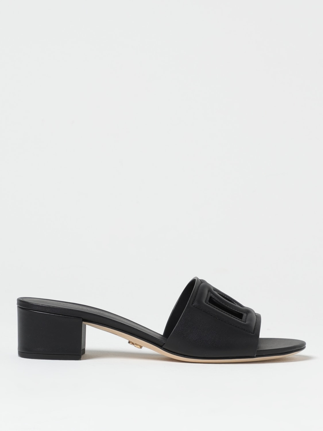 DESCRIPTION - Logo: DG monogram, Embossed - Lining: Leather, With logo - Model: Slip on - Toe: Open, Round - Sole: Leather - Heel: Low heel - Materials: Smooth calfskin - Pattern: Logo, Plain-colored DETAILS AND CARE Composition 100% CALF LEATHER/LEATHER SOLE SIZE AND FIT Sizes Heel: 4 cm Designer code: CR1755AY329 80999 Giglio Code: G43872 Designer: Dolce & Gabbana Collection: Dolce & Gabbana Woman Category: Shoes Dolce & Gabbana