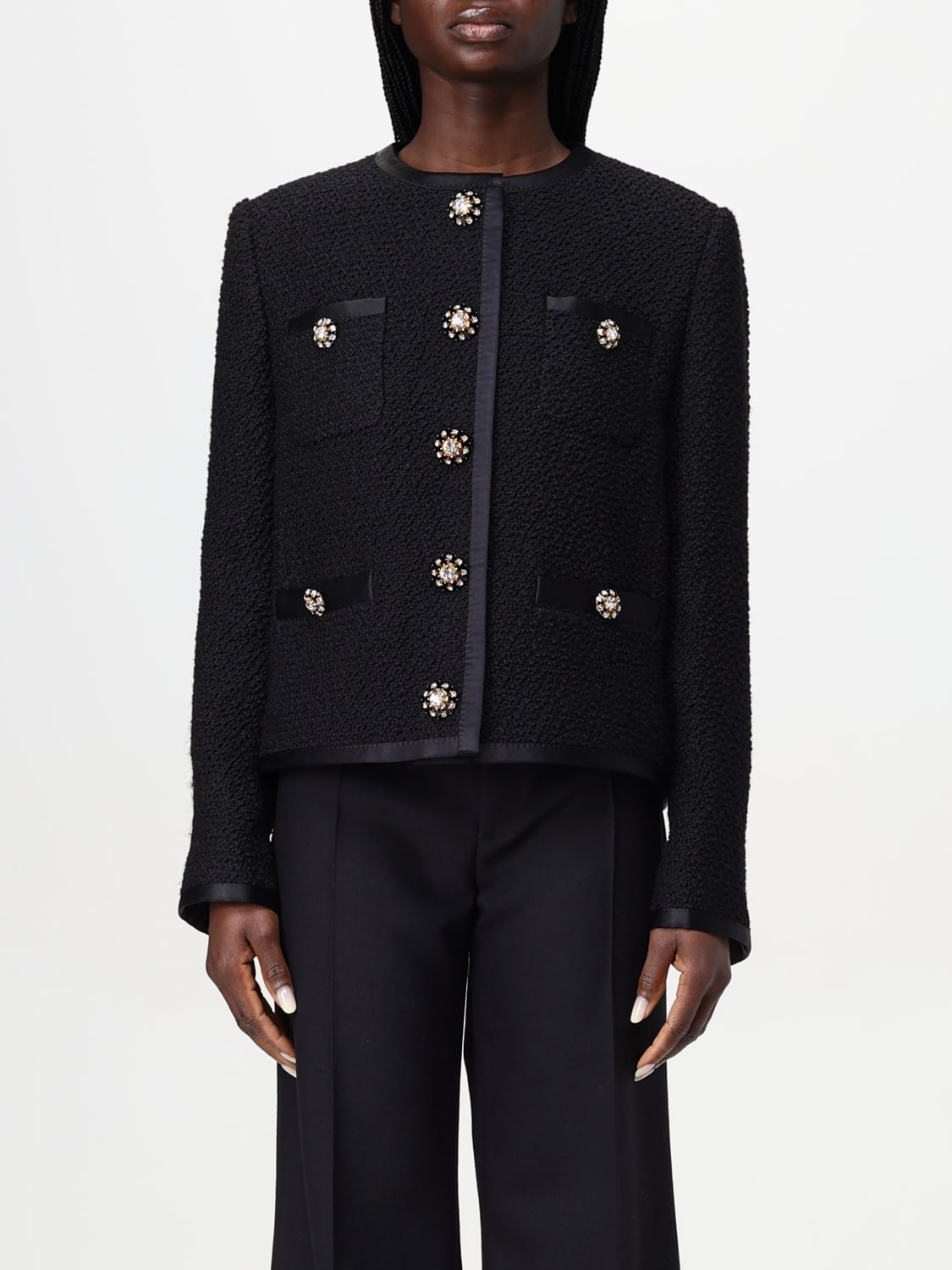 Cropped single-breasted raschel tweed jacket with bejeweled buttons