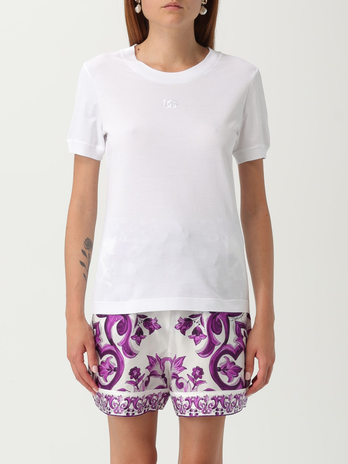 DESCRIPTION - Style: Minimal - Logo: DG monogram - Model: Crewneck - Neckline: Crewneck - Shoulders: Regular - Sleeves: Short - Bottom: With straight hemline - Materials: Cotton - Pattern: Plain-colored DETAILS AND CARE Composition 100% cotton SIZE AND FIT Sizes not available Size and fit Slim fit Designer code: F8N08ZGDC9C W0800 Giglio Code: H18328 Designer: Dolce & Gabbana Collection: Dolce & Gabbana Woman Category: Clothing Dolce & Gabbana