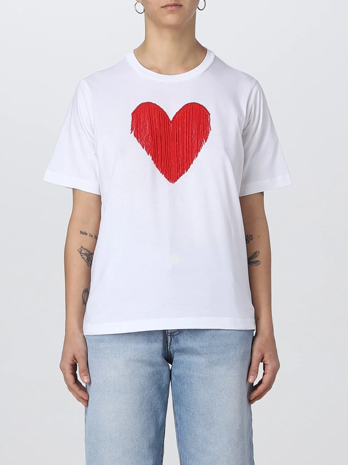 Descrizione - Casual style - Relaxed fit - Cotton - Heart print with fringe detail - Back contrasting Dsquared2 logo - Round neckline - Regular shoulders - Short sleeves - Straight hem - Hand wash - Made in Italy DETAILS AND CARE Composition 100% CO SIZE AND FIT Sizes not available Designer code: S75GD0335S23009 100 Giglio Code: 380976 Designer: Dsquared2 Collection: Dsquared2 Woman Category: Clothing Dsquared2