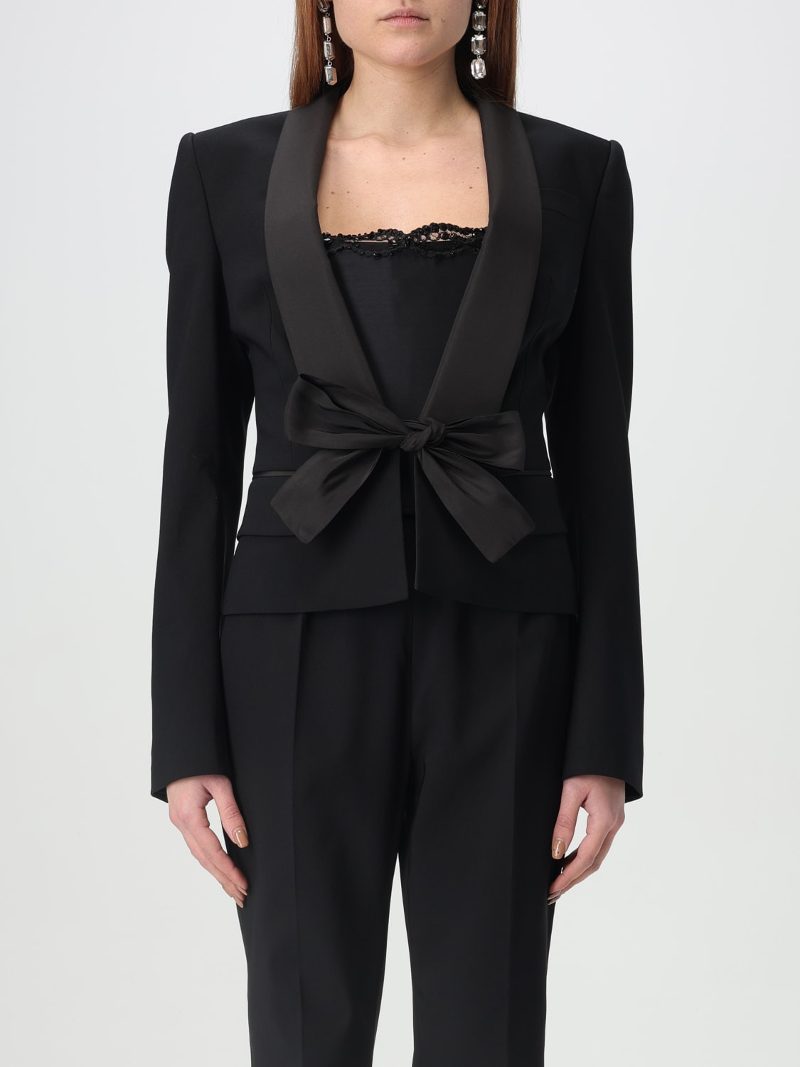 DESCRIPTION - Style: Elegant - Neck: Shawl - Shoulders: Regular - Sleeves: Long - Closure: With bands to tie - Bottom: With straight hemline - Length: Short jackets - Materials: Crepe - Pattern: Plain-colored DETAILS AND CARE Composition 94% polyester 6% elastane SIZE AND FIT Sizes not available Size and fit Slim fit Designer code: S75BN0910S60581 900 Giglio Code: G45597 Designer: Dsquared2 Collection: Dsquared2 Woman Category: Clothing Dsquared2