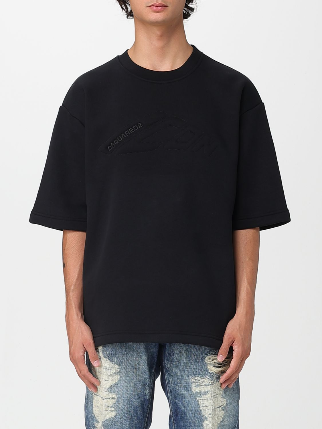DESCRIPTION - Style: Underground - Logo: Tone-on-tone - Model: Crewneck - Neckline: Crewneck - Shoulders: Relaxed - Sleeves: Short - Bottom: With straight hemline - Materials: Cotton blend - Pattern: Plain-colored DETAILS AND CARE Composition 66% Cotone 34% Poliestere SIZE AND FIT Sizes not available Size and fit Regular fit Designer code: S79GU0145D25007 900 Giglio Code: H16642 Designer: Dsquared2 Collection: Dsquared2 Men Category: Clothing Dsquared2