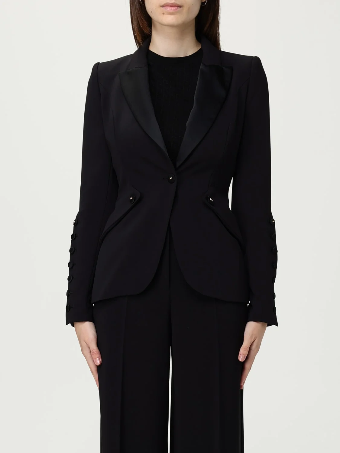 DESCRIPTION - Style: Classic - Model: Single-breasted - Shoulders: Regular - Sleeves: Long - Bottom: With straight hemline - Neck: Lapel - Pockets: With flap - Closure: 1-button - Length: Short jackets - Materials: Crepe - Pattern: Plain-colored DETAILS AND CARE Composition not available SIZE AND FIT Sizes not available Size and fit Regular fit Designer code: GI154 110 Giglio Code: H26113 Designer: Elisabetta Franchi Collection: Elisabetta Franchi Woman Category: Clothing Elisabetta Franchi