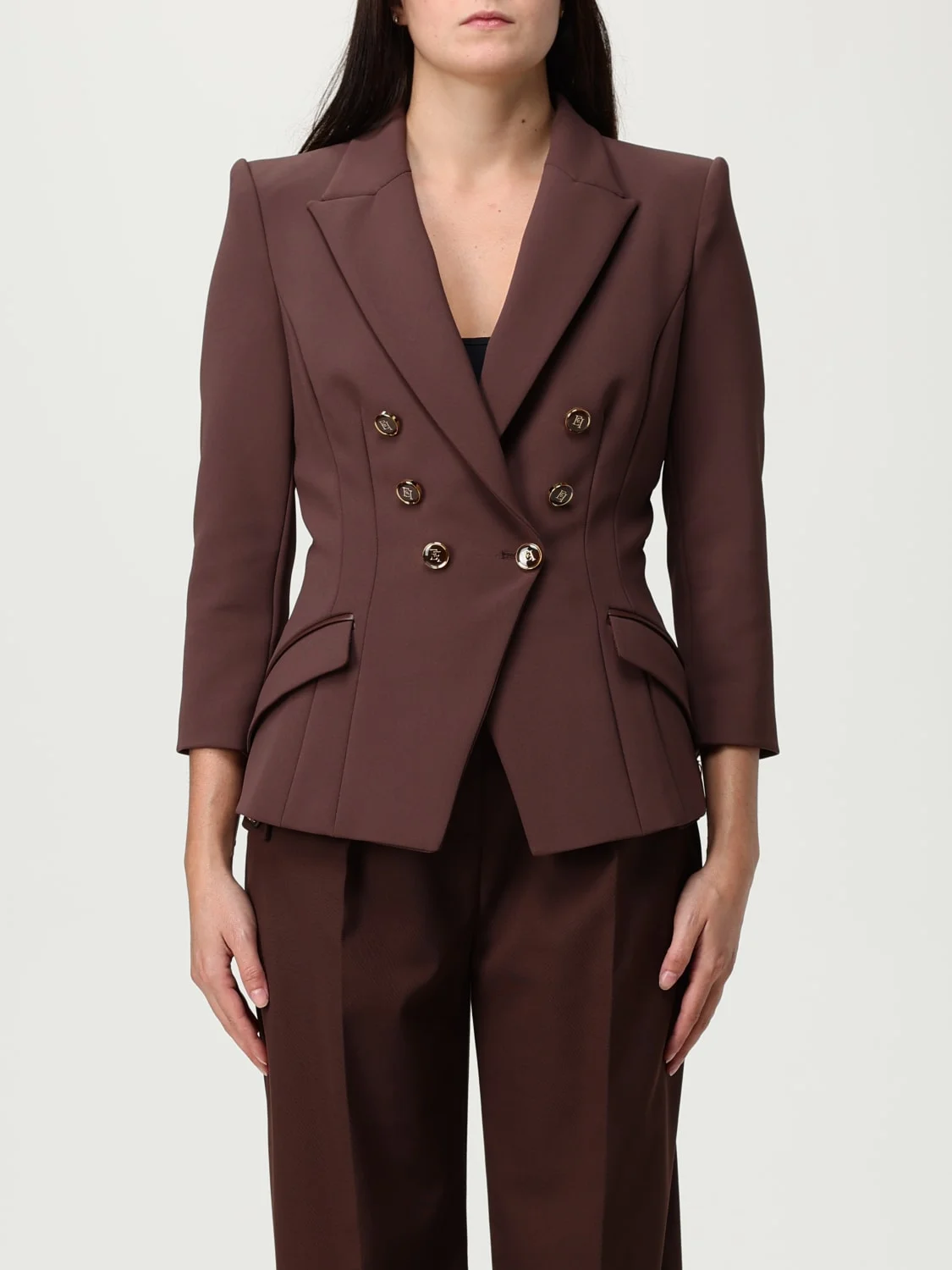 DESCRIPTION - Style: Classic, Elegant - Model: Double-breasted - Shoulders: Padded, Regular - Sleeves: Long - Closure: With buttons - Bottom: With straight hemline - Neck: Lapel - Pockets: With flap - Length: Short jackets - Materials: Crepe - Pattern: Plain-colored DETAILS AND CARE Composition 96%PL04%EA SIZE AND FIT Sizes not available Size and fit Regular fit Designer code: GI174 EA3 Giglio Code: 435297 Designer: Elisabetta Franchi Collection: Elisabetta Franchi Woman Category: Clothing Elisabetta Franchi