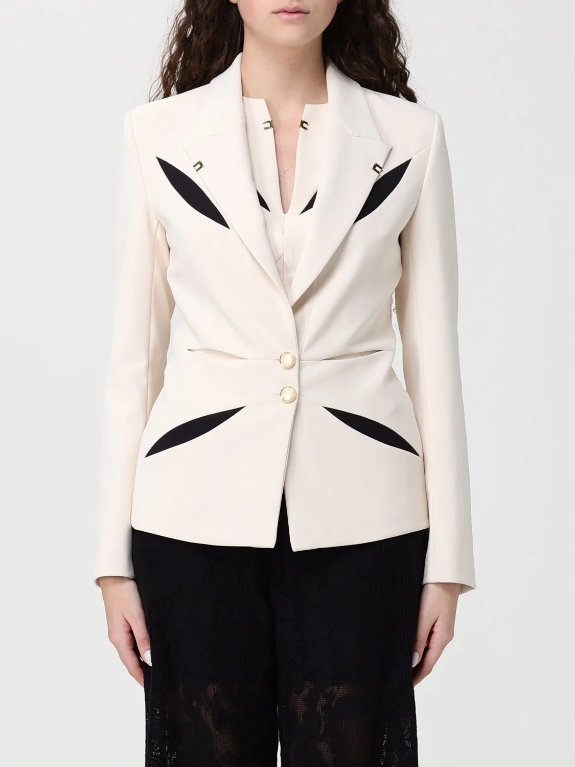 DESCRIPTION - Style: Formal - Model: Cut-out, Single-breasted - Shoulders: Regular - Sleeves: Long - Bottom: With straight hemline - Neck: Lapel - Closure: 2-button - Length: Short jackets - Materials: Crepe - Pattern: Plain-colored DETAILS AND CARE Composition not available SIZE AND FIT Sizes not available Size and fit Regular fit Designer code: GI19861E2 E84 Giglio Code: H89727 Designer: Elisabetta Franchi Collection: Elisabetta Franchi Woman Category: Clothing Elisabetta Franchi