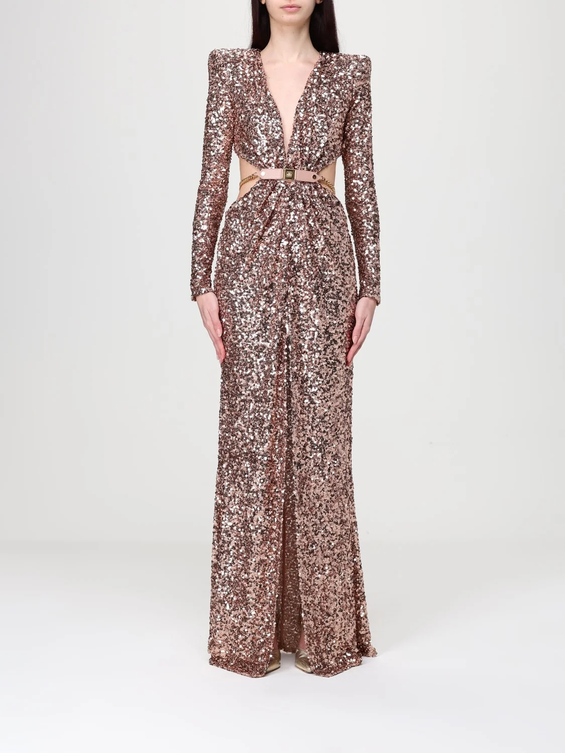 DESCRIPTION - Style: Elegant, Glamour - Details: Metal mesh - Model: Cut-out - Neckline: Deep V - Shoulders: Padded, Regular - Bottom: With front slit, With train - Closure: Concealed - Length: Long dresses - Occasion: Ceremony and cocktail dresses, Evening and party dresses - Sleeves: Long sleeve dresses - Materials: Polyester - Pattern: Embroidery, Plain-colored DETAILS AND CARE Composition 97% polyester, 3% elastane SIZE AND FIT Sizes not available Size and fit Slim fit Designer code: ABR1561E2 EA1 Giglio Code: H95923 Designer: Elisabetta Franchi Collection: Elisabetta Franchi Woman Category: Clothing Elisabetta Franchi