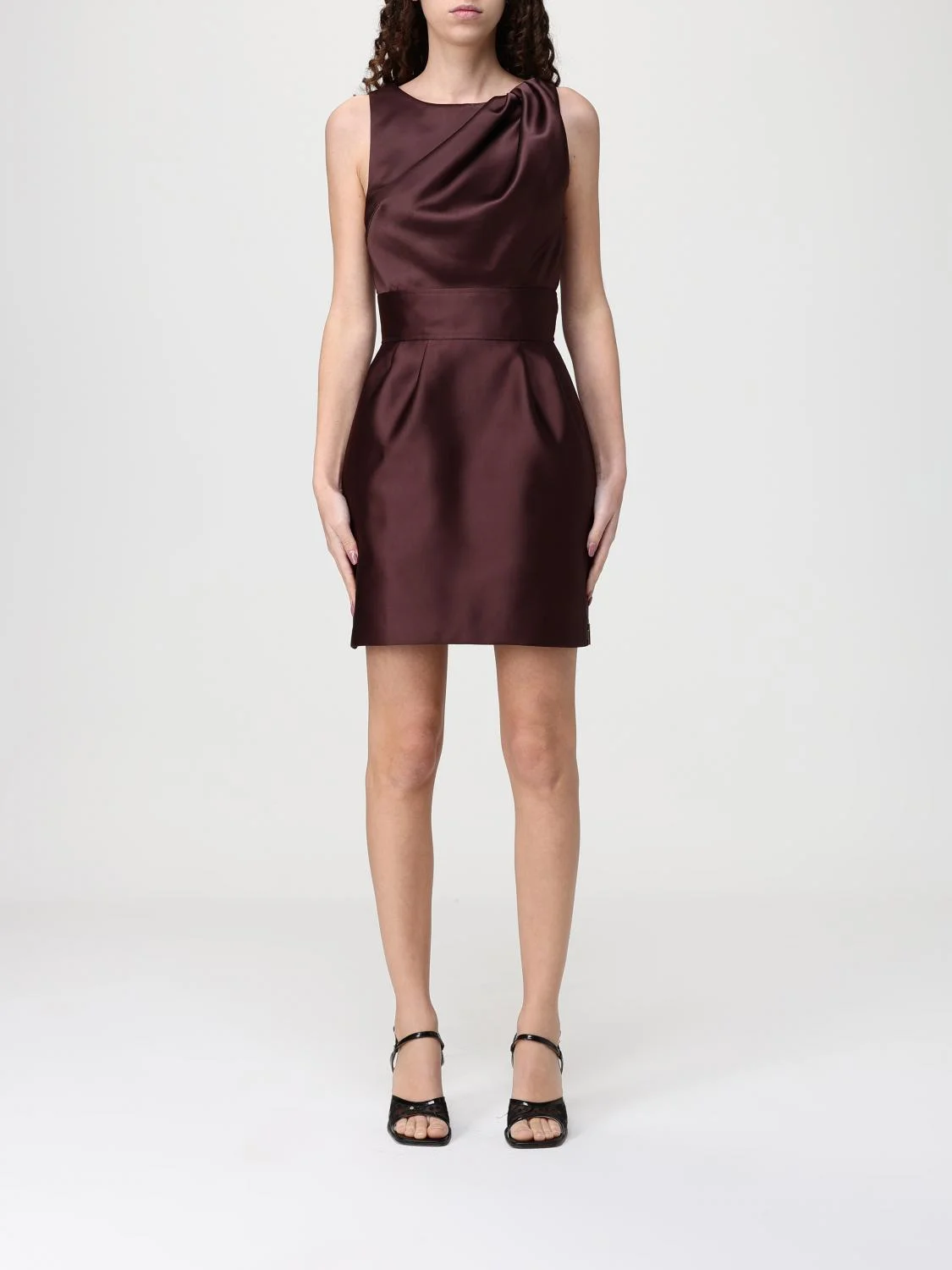 DESCRIPTION - Style: Elegant, Minimal - Model: Draped - Neckline: Crewneck - Shoulders: Regular - Closure: Back closure with concealed zip - Bottom: With straight hemline - Logo: With logo - Length: Mini dresses - Occasion: Evening and party dresses - Sleeves: Sleeveless dresses - Pattern: Plain-colored - Materials: Duchesse satin DETAILS AND CARE Composition not available SIZE AND FIT Sizes not available Size and fit Slim fit Designer code: AB87561E2 644 Giglio Code: H91241 Designer: Elisabetta Franchi Collection: Clothing Elisabetta Franchi Category: Clothing > Dress