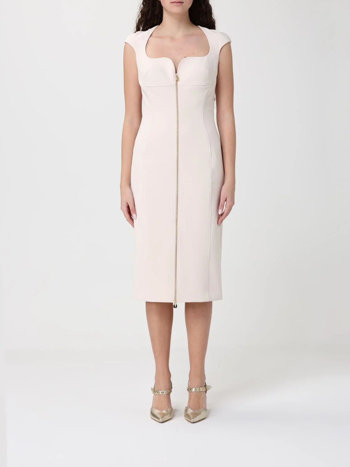 DESCRIPTION - Style: Elegant, Minimal - Model: Sheath - Neckline: Teardrop - Shoulders: Regular - Closure: With metal zip - Bottom: With straight hemline - Length: Midi dresses - Occasion: Ceremony and cocktail dresses, Morning dresses - Sleeves: Short-sleeve dresses - Materials: Polyester - Pattern: Plain-colored DETAILS AND CARE Composition 96% polyester, 4% elastane SIZE AND FIT Sizes not available Size and fit Slim fit Designer code: AB90061E2 193 Giglio Code: H98890 Designer: Elisabetta Franchi Collection: Elisabetta Franchi Woman Category: Clothing Elisabetta Franchi