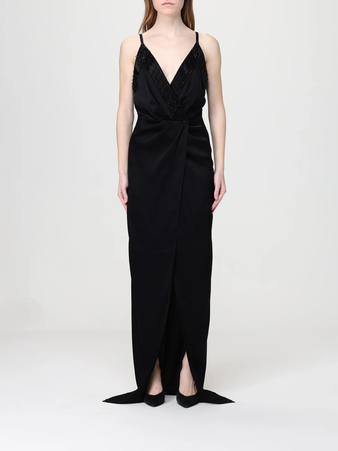 DESCRIPTION - Style: Classic, Elegant - Details: With beads - Neckline: V neckline - Shoulders: With thin shoulder straps - Closure: Back closure with zip - Bottom: With front slit, With straight hemline - Length: Long dresses - Occasion: Ceremony and cocktail dresses, Evening and party dresses - Sleeves: Off-the-shoulder dresses - Materials: Satin - Pattern: Embroidery, Plain-colored DETAILS AND CARE Composition not available SIZE AND FIT Sizes not available Size and fit Slim fit Designer code: ABR4862E2 110 Giglio Code: I10356 Designer: Elisabetta Franchi Collection: Clothing Elisabetta Franchi Category: Clothing > Dress