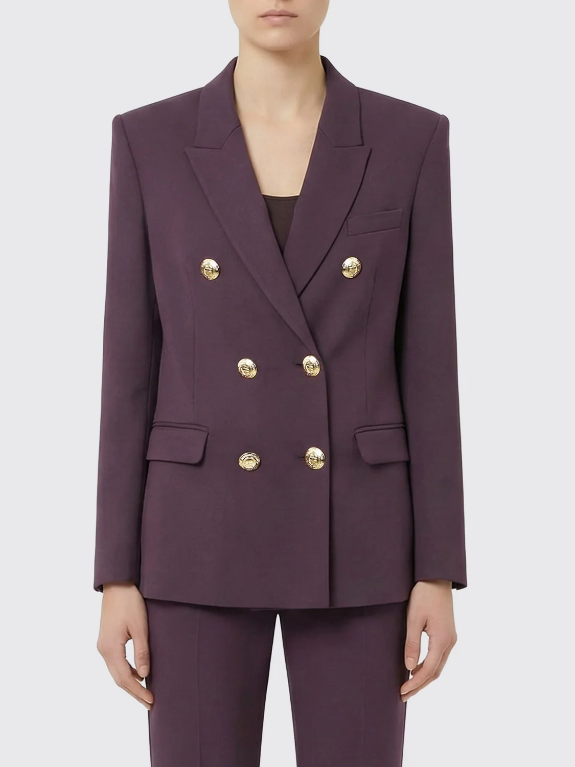 DESCRIPTION - Style: Classic, Formal - Model: Double-breasted - Shoulders: Regular - Sleeves: Long - Closure: With buttons - Bottom: With back slit, With straight hemline - Neck: Lapel - Pockets: With flap - Length: Short jackets - Materials: Stretch viscose - Pattern: Plain-colored DETAILS AND CARE Composition Viscose | 98% VISCOSE 2% ELASTANE SIZE AND FIT Sizes not available Size and fit Regular fit Designer code: GI20061E2 644 Giglio Code: H90793 Designer: Elisabetta Franchi Collection: Elisabetta Franchi Woman Category: Clothing Elisabetta Franchi