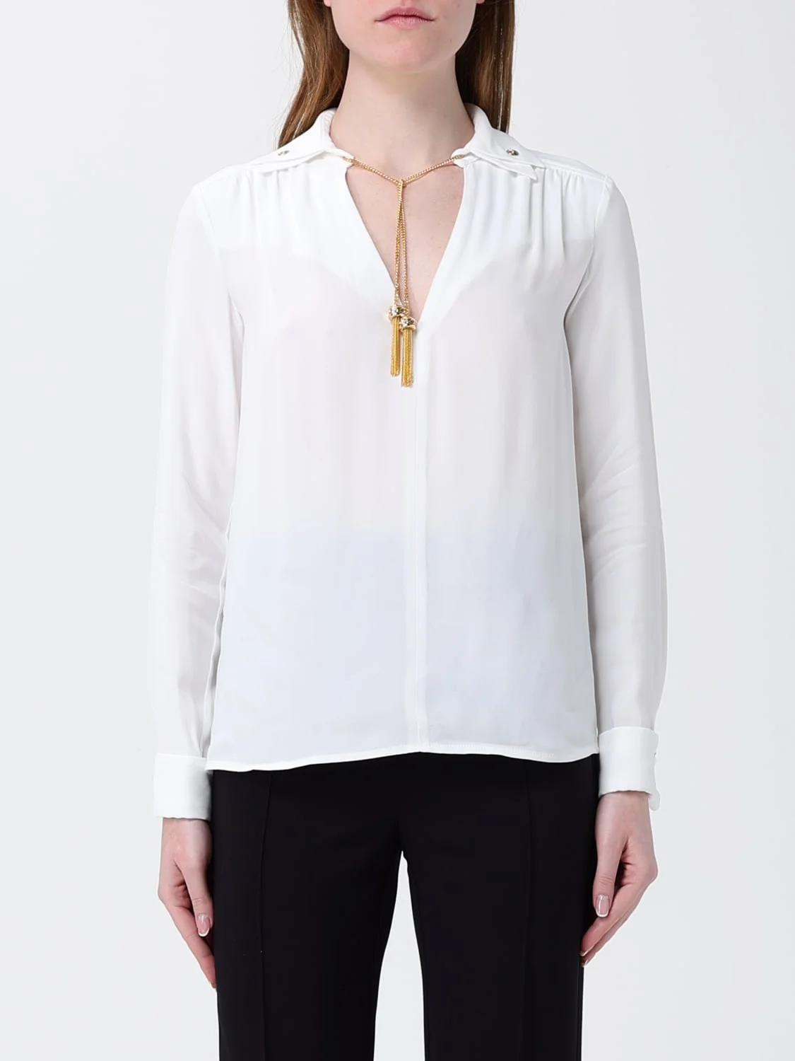 DESCRIPTION - Style: Elegant - Details: Jewel - Neckline: V neckline - Shoulders: Relaxed - Bottom: With straight hemline - Sleeves: Long sleeve tops - Materials: Crepe - Pattern: Plain-colored DETAILS AND CARE Composition not available SIZE AND FIT Sizes not available Size and fit Regular fit Designer code: CA15962E2 360 Giglio Code: I22208 Designer: Elisabetta Franchi Collection: Clothing Elisabetta Franchi Category: Clothing > Top
