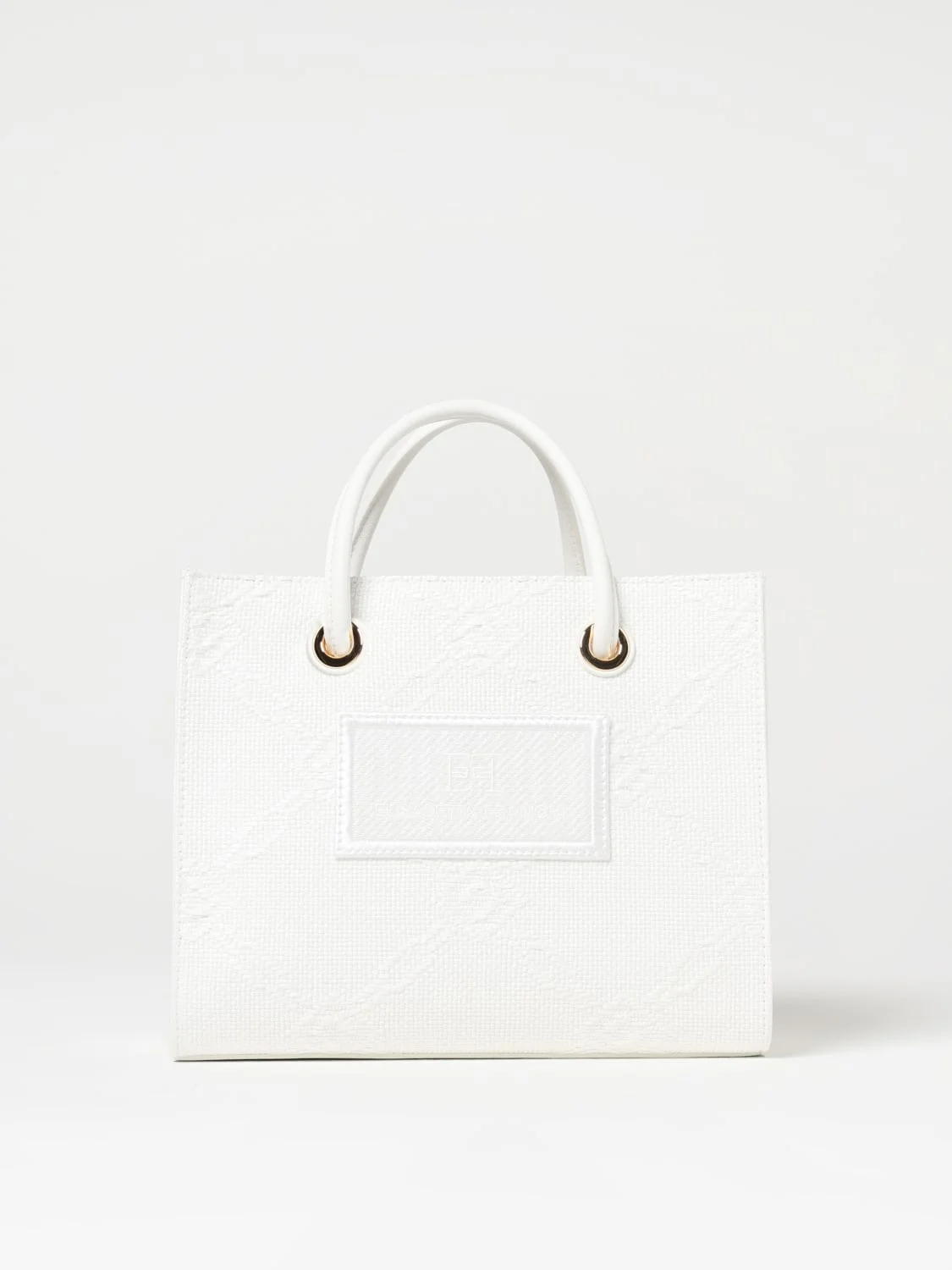 DESCRIPTION - Logo: Jacquard - Lining: Synthetic leather, With zip pocket - Model: Hand - Shape: Rectangular - Handle: Double - Materials: Raffia - Pattern: Monogram DETAILS AND CARE Composition 100 AF SIZE AND FIT Sizes Width : 25 cm Height: 20 cm Depth: 12 cm Designer code: BS83A5 360 Giglio Code: 426448 Designer: Elisabetta Franchi Collection: Elisabetta Franchi Woman Category: Bags Elisabetta Franchi