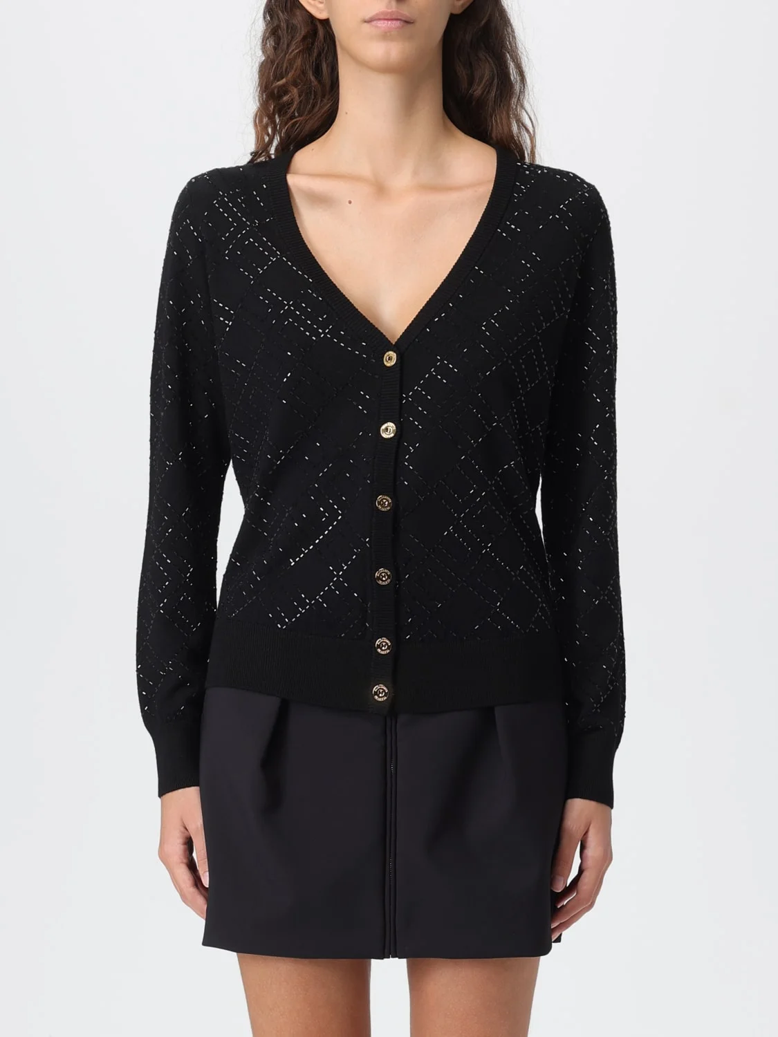 DESCRIPTION - Style: Classic, Minimal - Logo: Rhinestone - Neckline: V neckline - Shoulders: Regular - Sleeves: Long - Cuffs: Ribbed - Closure: With buttons - Bottom: With ribbed edges, With straight hemline - Materials: Wool - Pattern: Embroidery, Logo DETAILS AND CARE Composition 100%WO-EMBROIDERY:GLASS SIZE AND FIT Sizes not available Size and fit Regular fit Designer code: MK26B 188 Giglio Code: H27626 Designer: Elisabetta Franchi Collection: Elisabetta Franchi Woman Category: Clothing Elisabetta Franchi