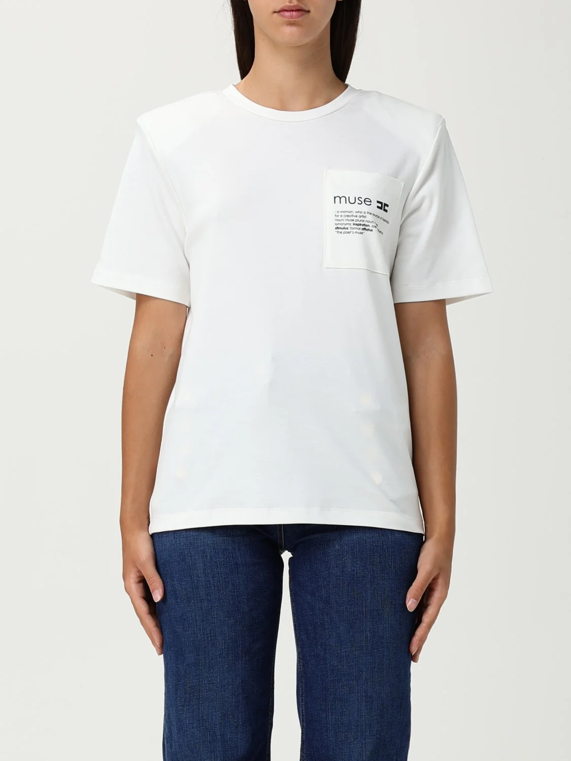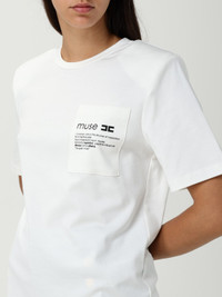 DESCRIPTION - Style: Contemporary - Logo: Contrasting - Model: Crewneck - Neckline: Crewneck - Shoulders: Padded - Sleeves: Short - Pockets: Patch pocket - Bottom: With straight hemline - Materials: Cotton - Pattern: Slogan DETAILS AND CARE Composition 100%CO Wash and Care Machine wash SIZE AND FIT Sizes not available Size and fit Slim fit Designer code: MA020 270 Giglio Code: H26688 Designer: Elisabetta Franchi Collection: Elisabetta Franchi Woman Category: Clothing Elisabetta Franchi