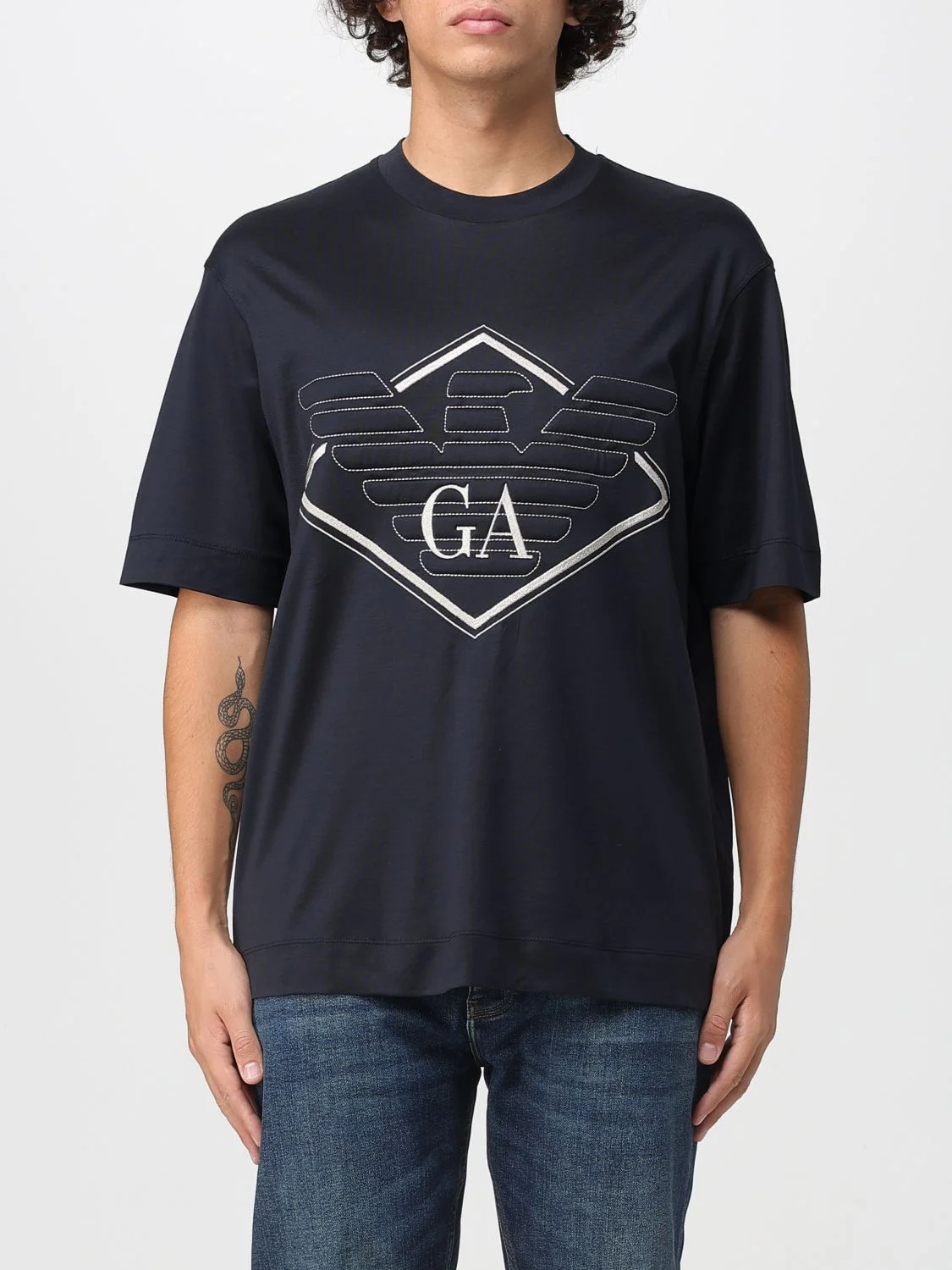 DESCRIPTION - Style: Sporty - Logo: Armani Eagle - Neckline: Crewneck - Shoulders: Relaxed - Sleeves: Short - Bottom: With straight hemline - Materials: Lyocell - Pattern: Logo DETAILS AND CARE Composition FABRIC : LYOCELL 70% COTTON 30% SIZE AND FIT Sizes not available Size and fit Regular fit Designer code: EM002835AF10761 UB118 Giglio Code: 434904 Designer: Emporio Armani Collection: Emporio Armani Men Category: Clothing Emporio Armani