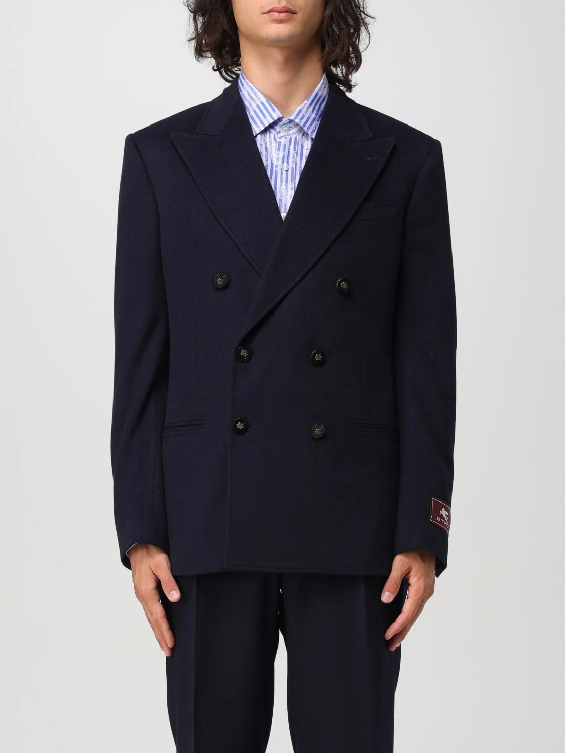 DESCRIPTION - Style: Elegant - Model: Double-breasted - Neck: Peak lapels - Sleeves: Long - Closure: With buttons - Pockets: Slit pocket - Logo: Etro Pegaso - Materials: Cashmere - Pattern: Plain-colored DETAILS AND CARE Composition 100% Cashmere SIZE AND FIT Sizes not available Size and fit Regular fit Designer code: MRCA002699TU2H8 B0387 Giglio Code: 411121 Designer: Etro Collection: Etro Men Category: Clothing Etro