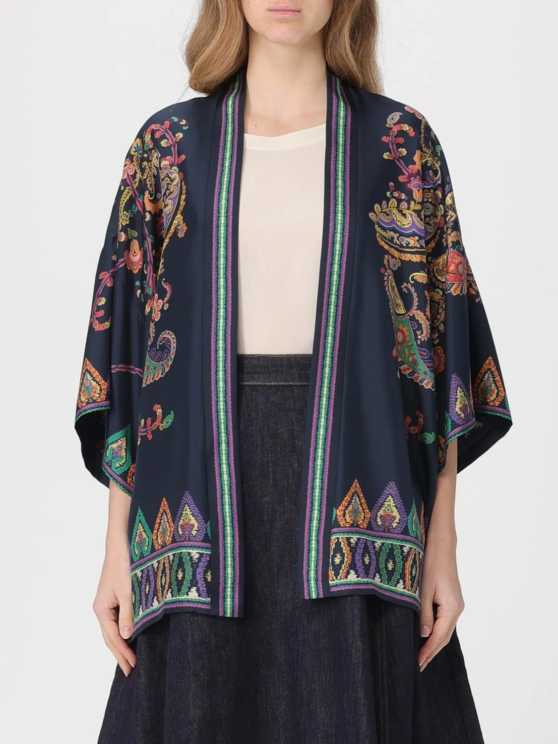 DESCRIPTION - Style: Ethnic - Shoulders: Relaxed - Sleeves: Long - Closure: Absent - Bottom: With straight hemline - Length: Short jackets - Materials: Silk - Pattern: Paisley DETAILS AND CARE Composition 100% Seta SIZE AND FIT Sizes not available Size and fit Regular fit Designer code: WRCA0025AKG03 X0883 Giglio Code: 439897 Designer: Etro Collection: Etro Woman Category: Clothing Etro