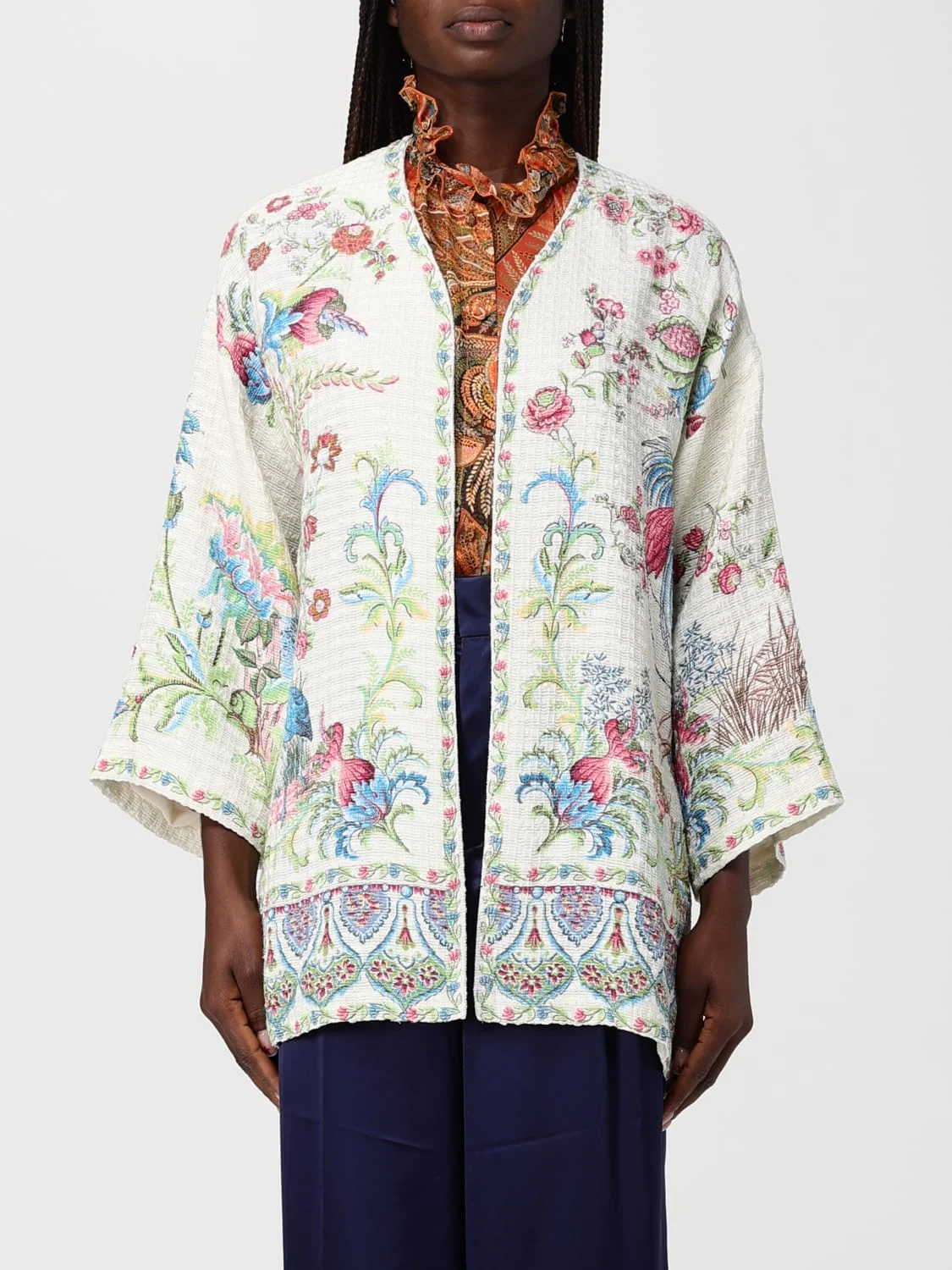 DESCRIPTION - Style: Vintage - Neckline: V neckline - Shoulders: Relaxed - Sleeves: Long - Closure: Absent - Bottom: With straight hemline - Occasion: Morning - Length: Short jackets - Materials: Cotton blend - Pattern: Floral DETAILS AND CARE Composition 59% Cotone 38% Viscosa 3% Poliammide SIZE AND FIT Sizes not available Size and fit Regular fit Designer code: WRCA0024AKH04 X0802 Giglio Code: 439847 Designer: Etro Collection: Clothing Etro Category: Clothing > Jacket