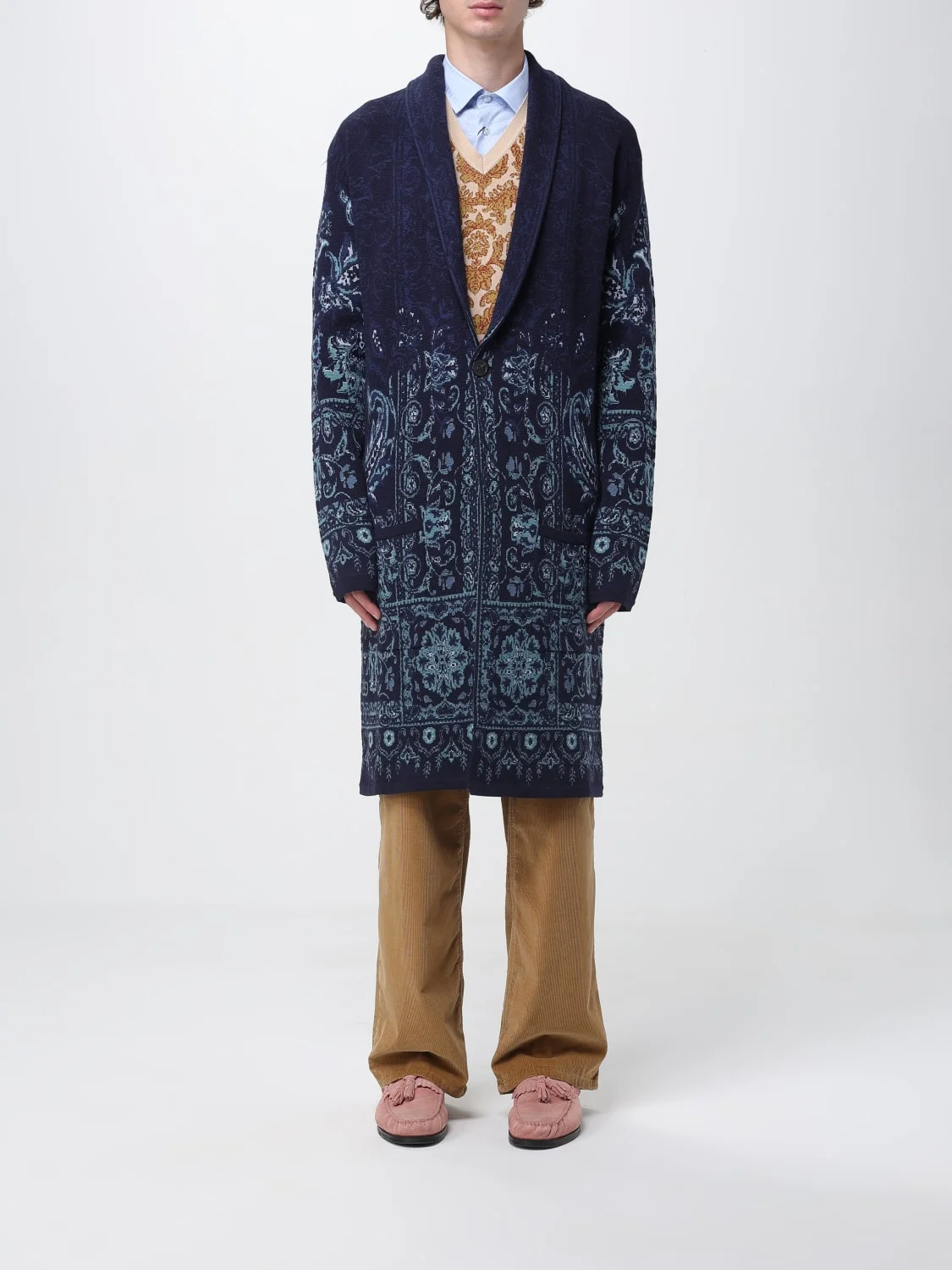DESCRIPTION - Style: Ethnic - Length: Long - Neck: Shawl - Neckline: Deep V - Shoulders: Relaxed - Sleeves: Long - Pockets: Slit pocket - Bottom: With straight hemline - Closure: 1-button - Model: Knit - Materials: Wool - Pattern: Paisley DETAILS AND CARE Composition not available SIZE AND FIT Sizes not available Size and fit Regular fit Designer code: MRKG0008AQ177 S9883 Giglio Code: H47570 Designer: Etro Collection: Etro Men Category: Clothing Etro