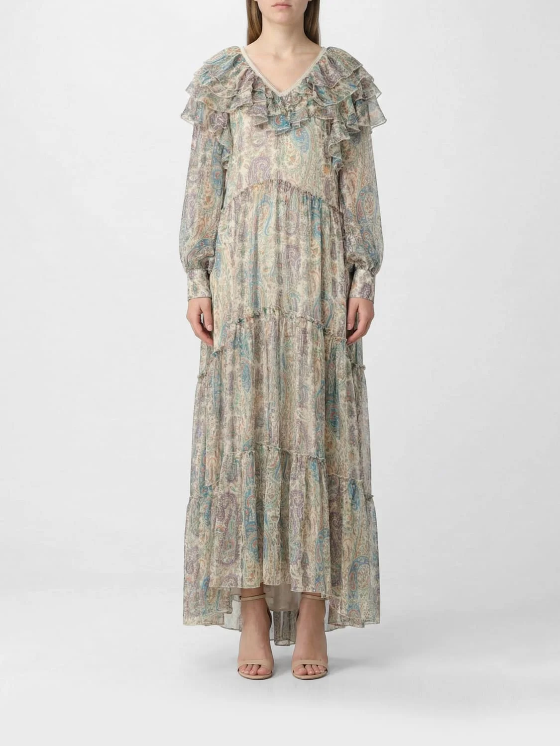 DESCRIPTION - Style: Bohemien, Elegant - Details: With ruffles - Neckline: Back U neckline, V neckline - Shoulders: Relaxed - Bottom: With straight hemline - Length: Long dresses - Occasion: Morning dresses - Sleeves: Long sleeve dresses - Materials: Silk - Pattern: Paisley DETAILS AND CARE Composition Silk | 100% Silk SIZE AND FIT Sizes not available Size and fit Relaxed fit Designer code: WRHA056699SA1N4 X0804 Giglio Code: H88235 Designer: Etro Collection: Etro Woman Category: Clothing Etro
