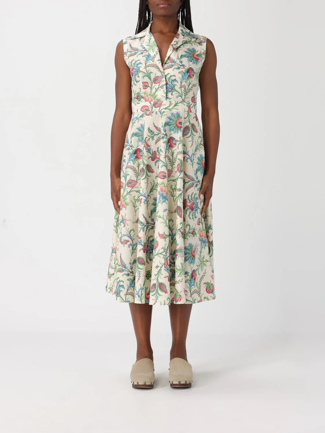 DESCRIPTION - Style: Ethnic - Model: Chemisier - Neck: Classic - Neckline: V neckline - Shoulders: Regular - Closure: With buttons - Pockets: America - Bottom: With straight hemline - Length: Midi dresses - Occasion: Morning dresses - Sleeves: Sleeveless dresses - Materials: Cotton - Pattern: Floral DETAILS AND CARE Composition _100 % CO SIZE AND FIT Sizes not available Size and fit Regular fit Designer code: WRHA040399SA5R9 X0803 Giglio Code: H92715 Designer: Etro Collection: Etro Woman Category: Clothing Etro