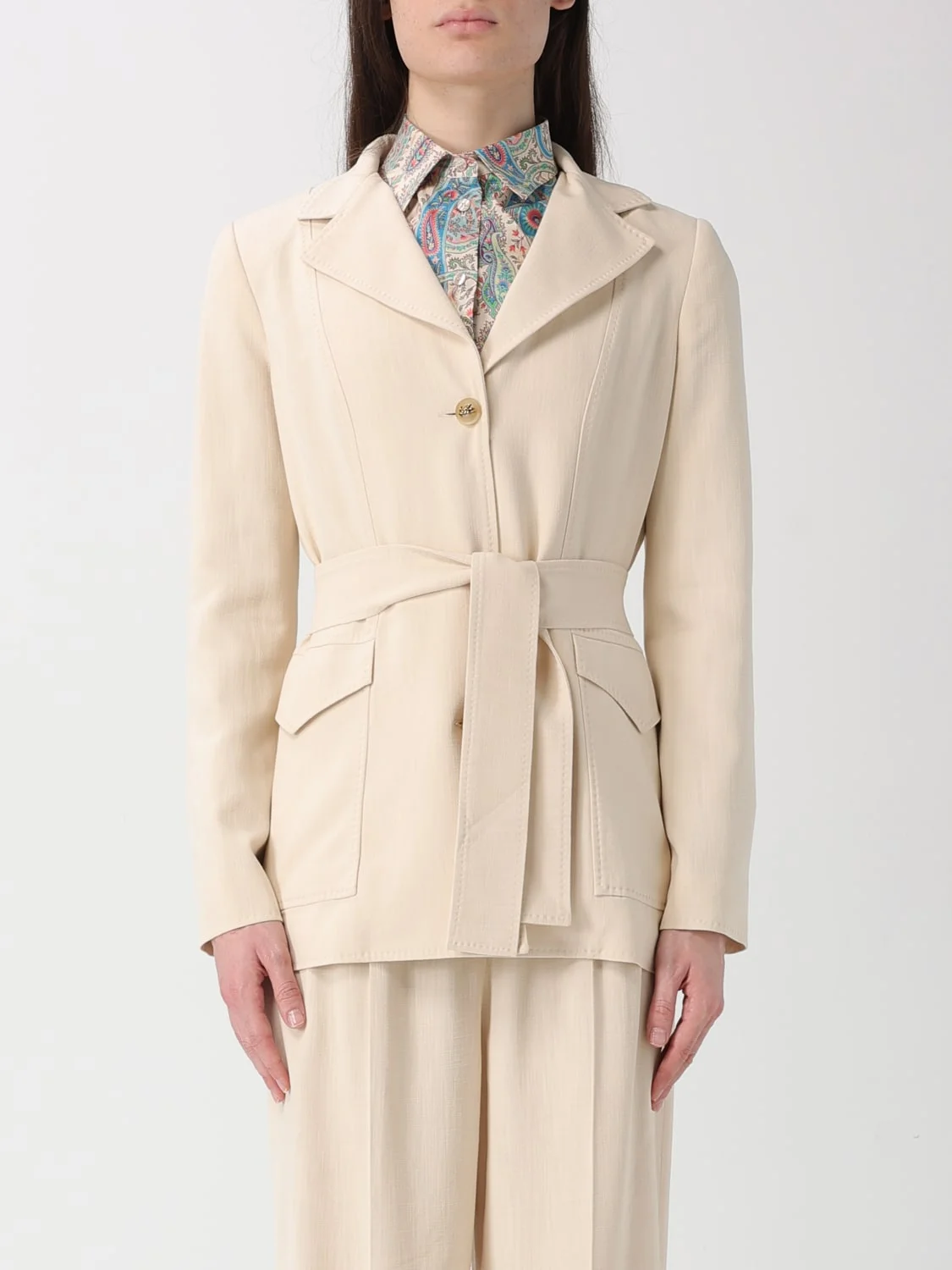 DESCRIPTION - Style: Safari - Model: Robe - Neck: Peak lapels - Neckline: V neckline - Shoulders: Regular - Sleeves: Long - Closure: With buttons - Waist: With waist band to tie - Bottom: With straight hemline - Pockets: Patch with flap - Length: Short jackets - Materials: Viscose - Pattern: Plain-colored DETAILS AND CARE Composition 100% Viscosa Wash and Care Dry clean SIZE AND FIT Sizes not available Size and fit Regular fit Designer code: WRCA011599TU4G4 W3789 Giglio Code: H94562 Designer: Etro Collection: Etro Woman Category: Clothing Etro