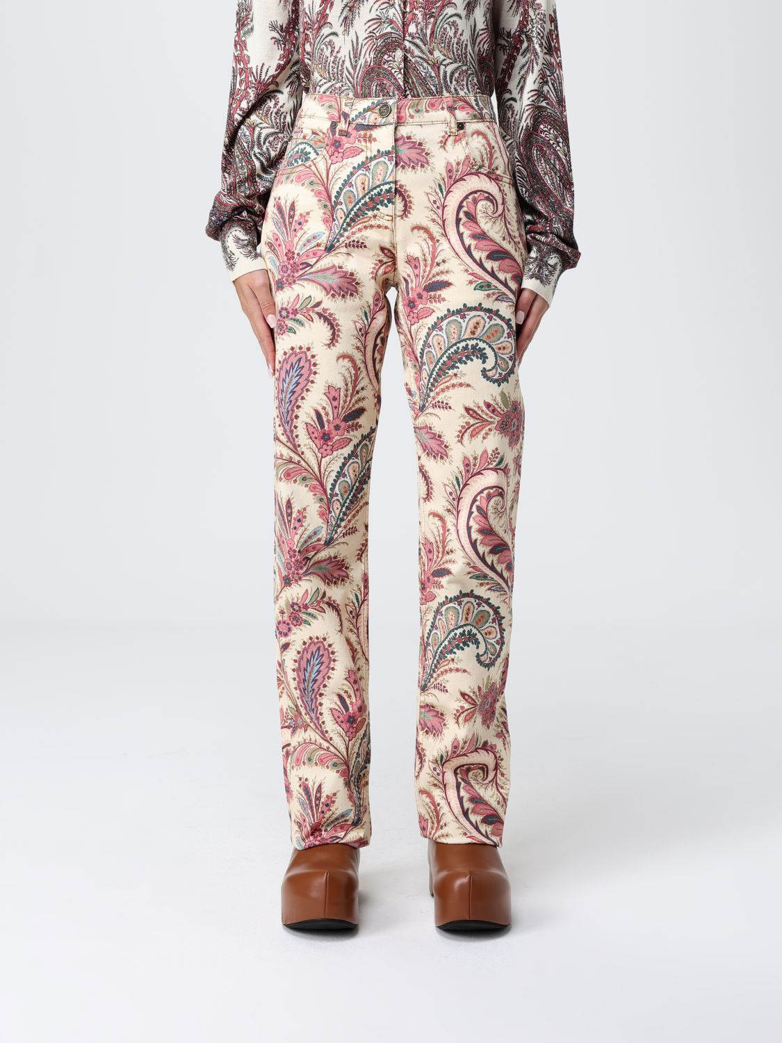 DESCRIPTION - Style: Ethnic - Pockets: 5-pocket - Waist: High waist - Bottom: With straight hemline - Closure: With button and zip - Materials: Cotton denim - Pattern: Paisley DETAILS AND CARE Composition 97% cotone, 3% elastan SIZE AND FIT Sizes not available Size and fit Regular fit Designer code: WRNB0019AKA33 X0801 Giglio Code: H47558 Designer: Etro Collection: Etro Woman Category: Clothing Etro