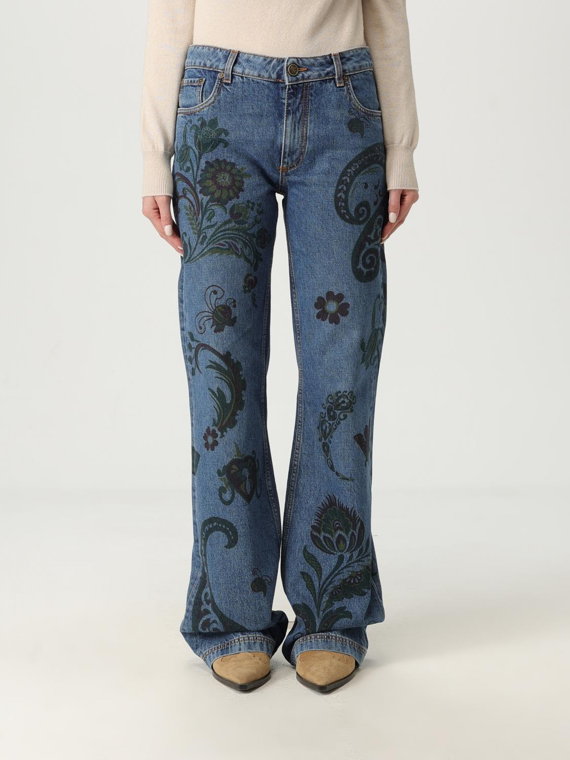 DESCRIPTION - Style: Bohemien - Pockets: 5-pocket - Waist: undefined - Bottom: With straight hemline - Closure: With button and zip - Materials: Cotton denim - Pattern: Paisley DETAILS AND CARE Composition not available SIZE AND FIT Sizes not available Size and fit Regular fit Designer code: WRNB0029AKC92 S9880 Giglio Code: H31288 Designer: Etro Collection: Etro Woman Category: Clothing Etro