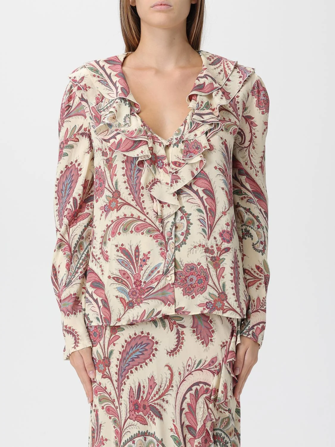DESCRIPTION - Style: Classic - Details: With ruffles - Neckline: V neckline - Shoulders: Regular - Closure: With buttons - Pockets: Patch pocket - Bottom: With curved hemline - Sleeves: Long sleeve shirts - Materials: Silk - Pattern: Paisley DETAILS AND CARE Composition not available SIZE AND FIT Sizes not available Size and fit Regular fit Designer code: WRIA0079994B7 X0802 Giglio Code: H32825 Designer: Etro Collection: Etro Woman Category: Clothing Etro