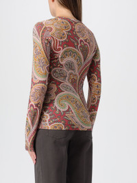DESCRIPTION - Style: Ethnic, Vintage - Model: Crewneck - Neckline: Crewneck - Shoulders: Regular - Sleeves: Long - Cuffs: Ribbed - Bottom: With ribbed edges, With straight hemline - Materials: Wool - Pattern: Paisley DETAILS AND CARE Composition 71% Lana 24% Poliammide 5% Elastan SIZE AND FIT Sizes not available Size and fit Slim fit Designer code: WRJB002699IAB08 X0867 Giglio Code: 433458 Designer: Etro Collection: Etro Woman Category: Clothing Etro
