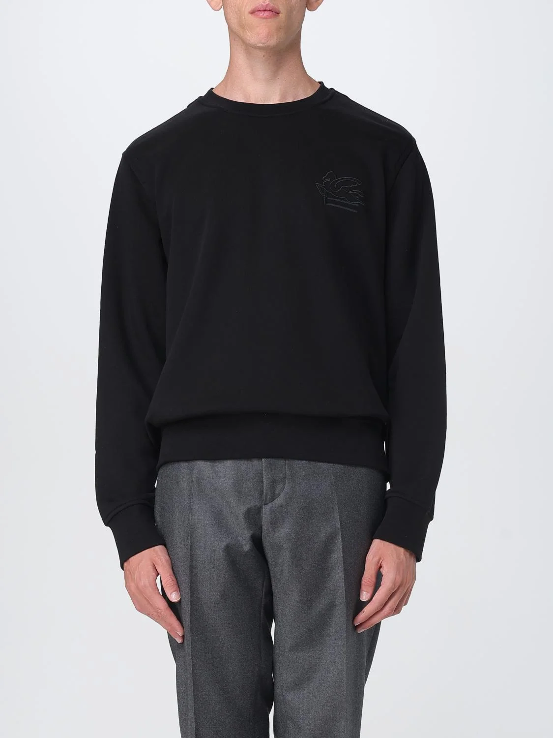 DESCRIPTION - Style: Minimal - Logo: Etro Pegaso - Neckline: Crewneck - Shoulders: Regular - Sleeves: Long - Cuffs: Stretch - Bottom: With straight hemline - Materials: Cotton - Pattern: Plain-colored DETAILS AND CARE Composition not available SIZE AND FIT Sizes not available Size and fit Regular fit Designer code: MRMB0010AJ292 N0000 Giglio Code: H32787 Designer: Etro Collection: Etro Men Category: Clothing Etro