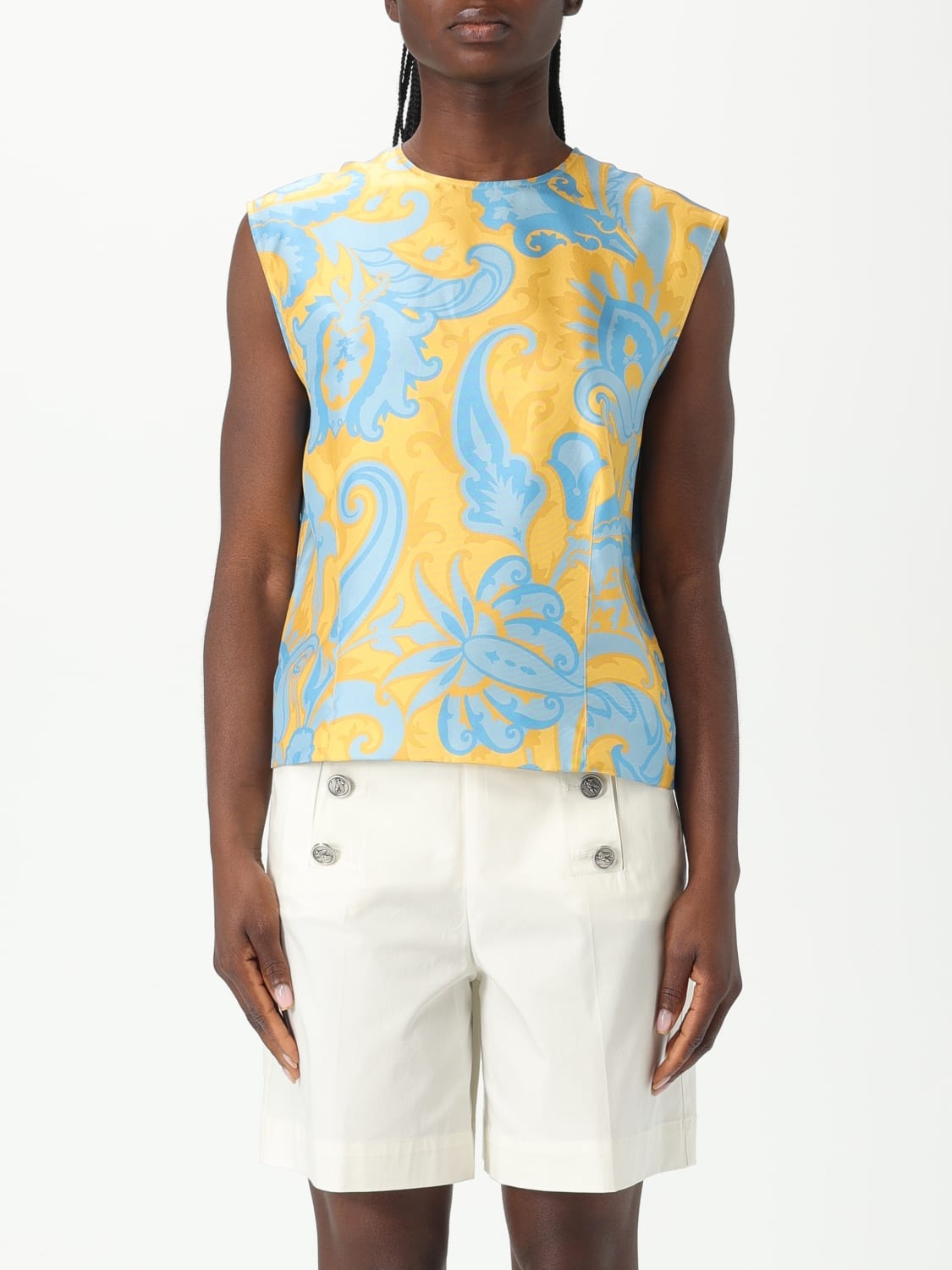 DESCRIPTION - Style: Classic - Neckline: Crewneck - Shoulders: Regular - Closure: Back closure with buttons - Bottom: With straight hemline - Model: Sleeveless - Sleeves: Sleeveless tops - Materials: Silk - Pattern: Paisley DETAILS AND CARE Composition 100% Seta SIZE AND FIT Sizes not available Size and fit Regular fit Designer code: WRJA008699SA1G6 X0841 Giglio Code: 423703 Designer: Etro Collection: Etro Woman Category: Clothing Etro